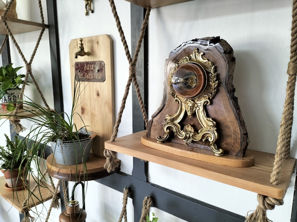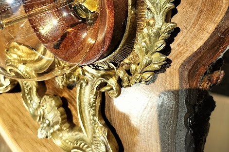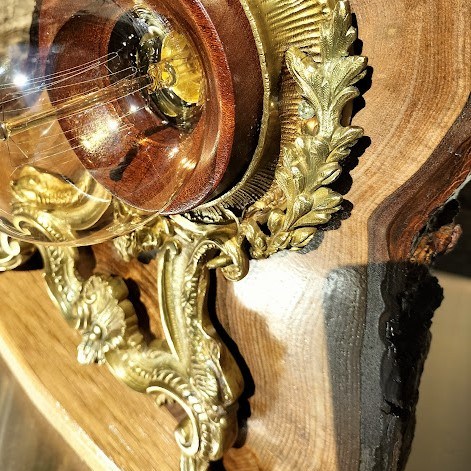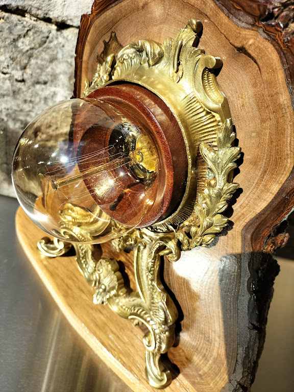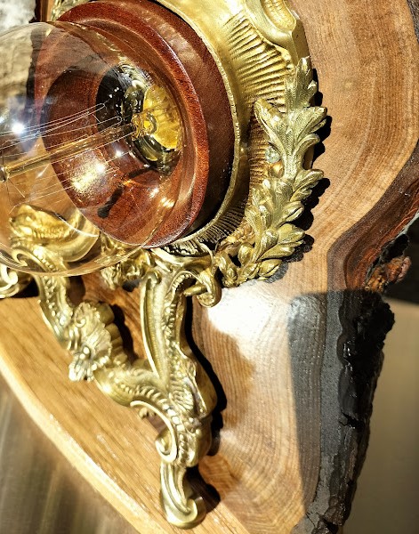 Le bois brut contraste avec les ornements en métal doré, les piéces de bois rouge souligne l’ampoule et donne du volume à l’ensemble.