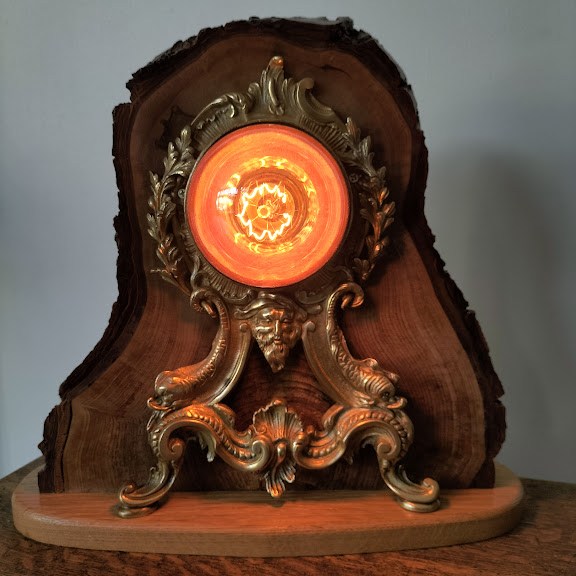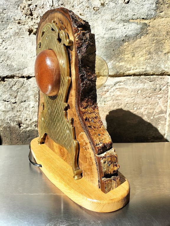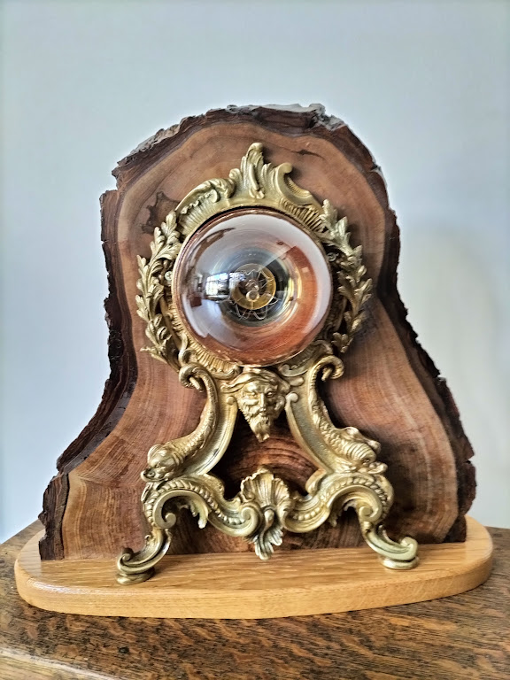Dans cette lampe totalement décalée, une rondelle de noyer meusien est prise en sandwich entre les 2 faces de la pendule. De ce fait, la lampe est aussi esthétique de face que de dos.