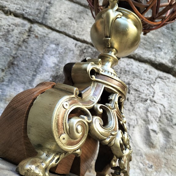 La bulle est délicatement posée sur un ancien chenet de cheminée. Pour donner du volume au pied de la lampe, nous avons taillé un bloc de chêne.