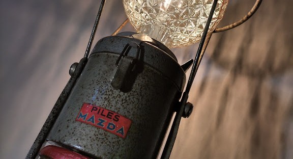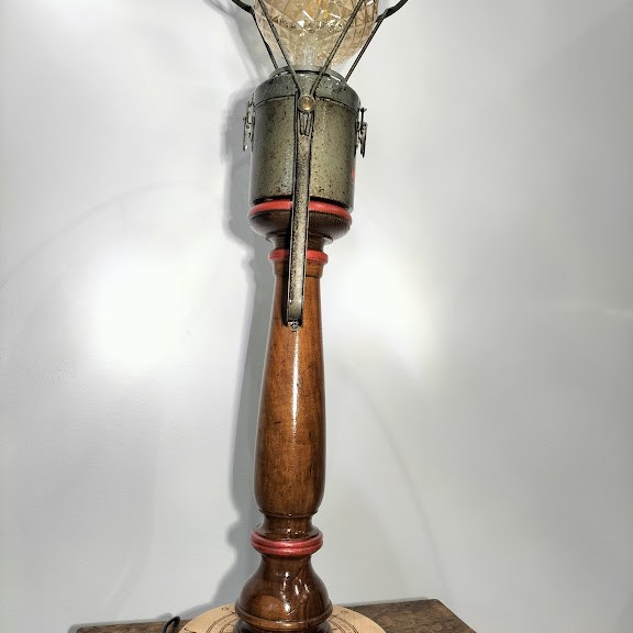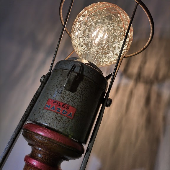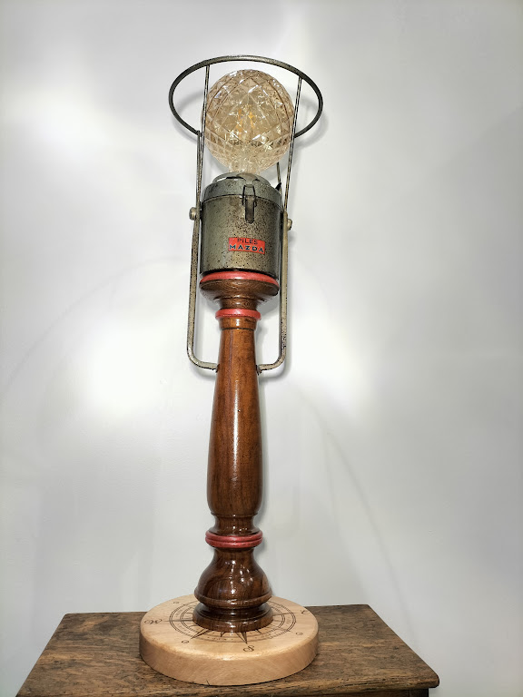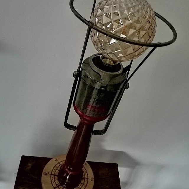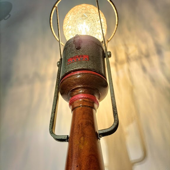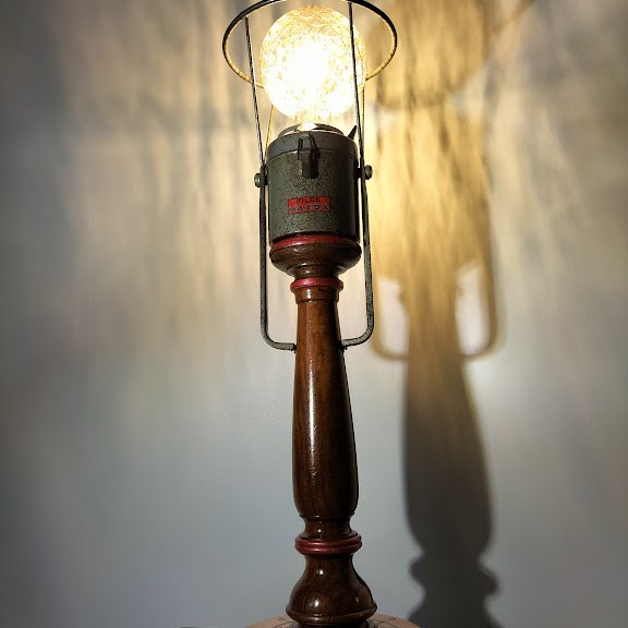 Créée à partir d’une ancienne lampe de camping MAZDA et montée sur un pied en noyer, cette lampe est imaginée comme un phare. Nous avons laissé volontairement les marques du temps sur la lampe mais l’avons traité contre la rouille.