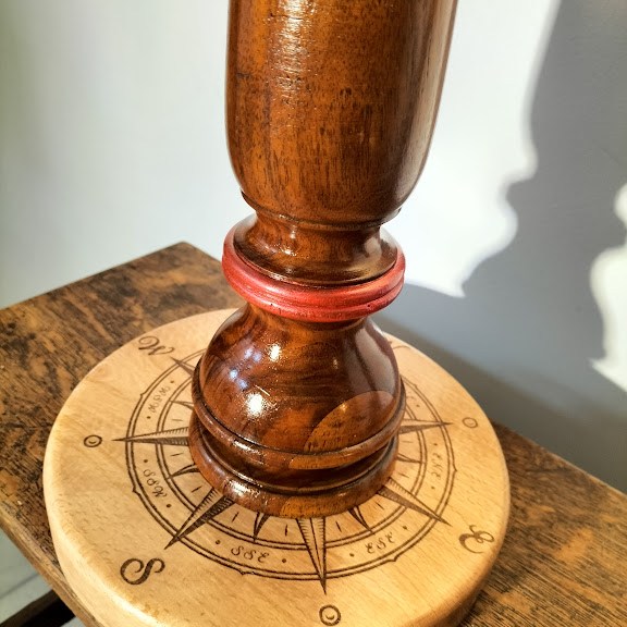 Sa base gravée d’une rose des vents et son ampoule à facettes complètent la création.