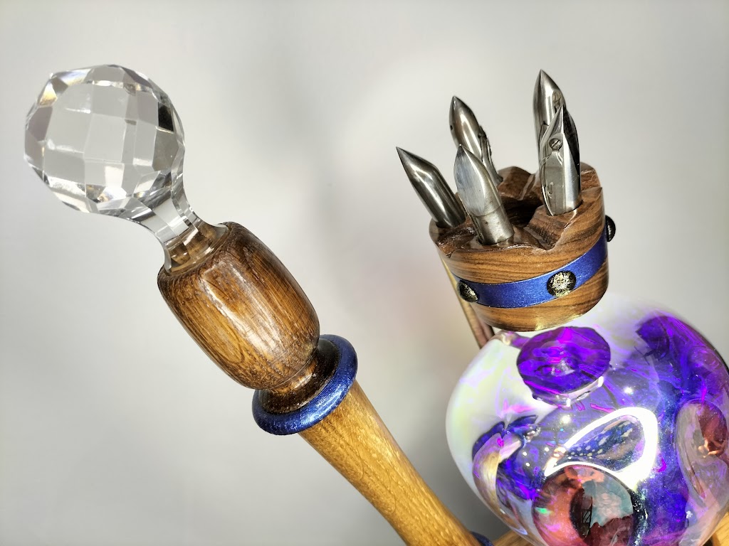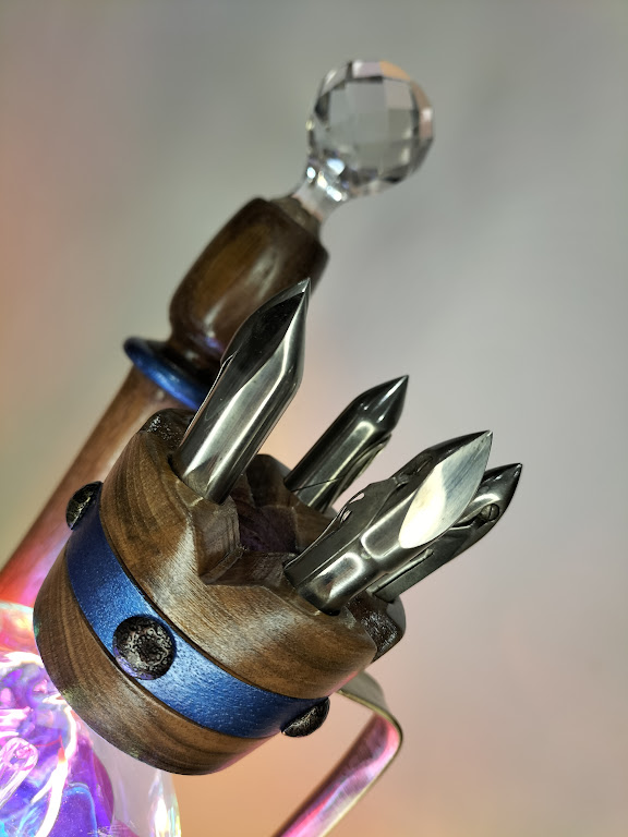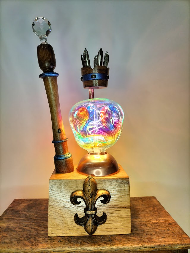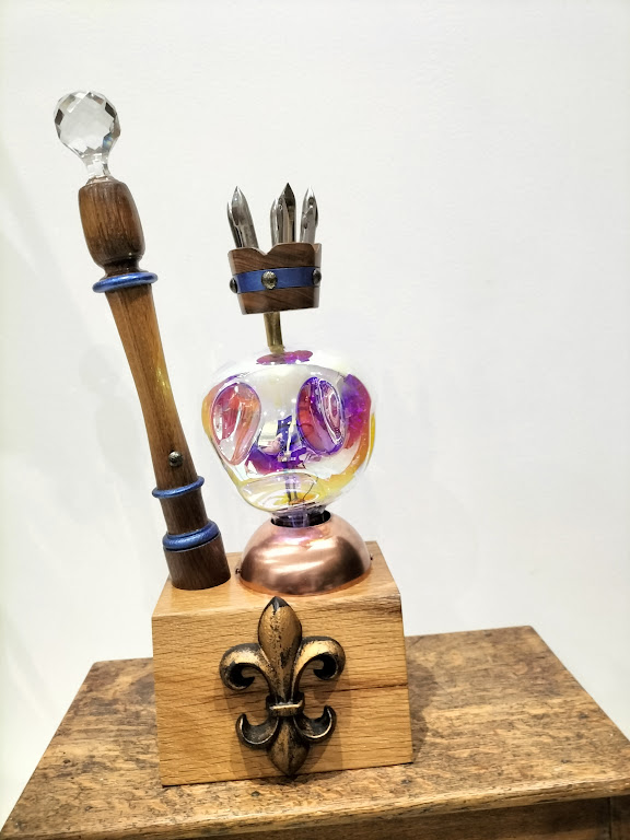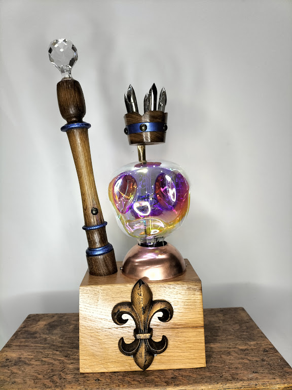 Le buste du souverain (louche en cuivre) est posé sur un plot de chêne sur lequel est érigé son sceptre avec son bouchon de carafe en cristal.