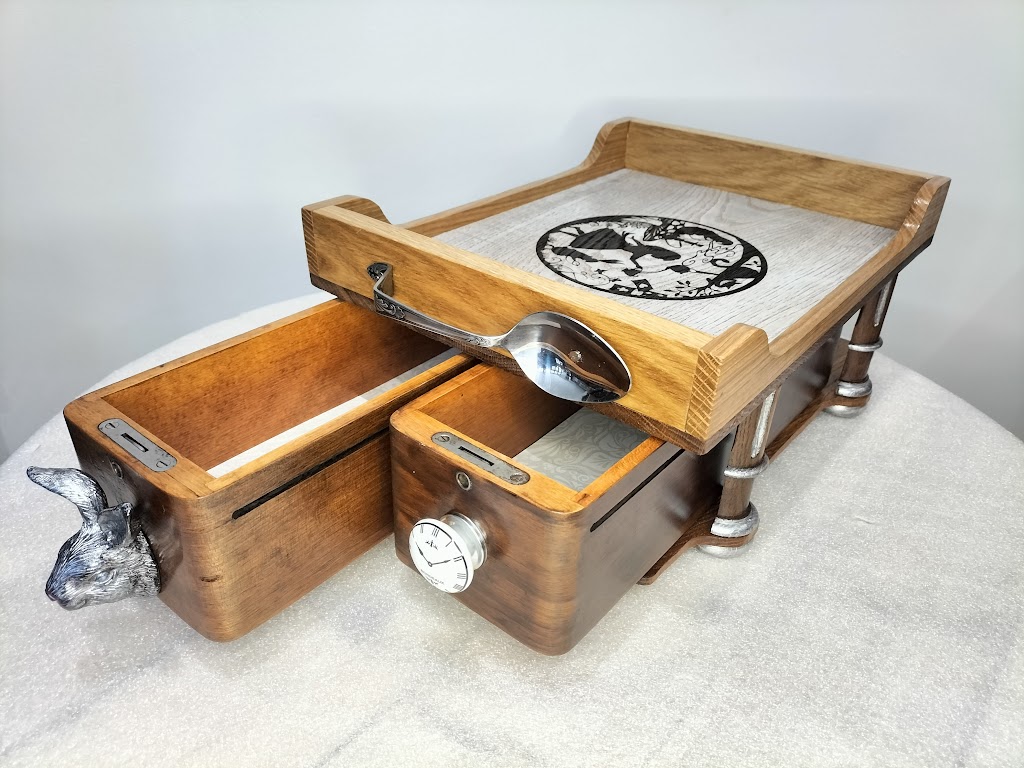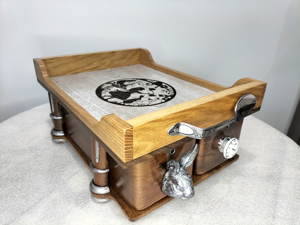 Unique et original, ce plateau de service est créé en chêne recyclé. Le dessus est blanchi et gravé d’un dessin sur le thème d’Alice.