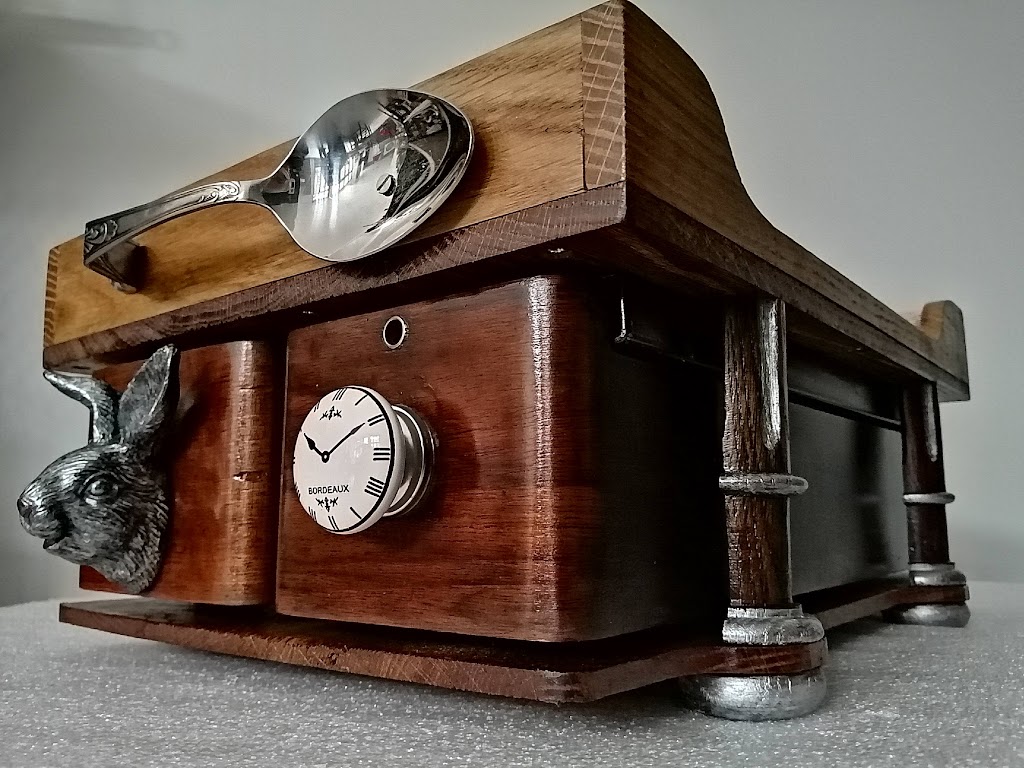 Vous noterez les 2 tiroirs de machine à coudre avec le lapin et sa montre pour y ranger thé et p’tits gâteaux sans oublier les poignées du plateau réalisées avec des couverts.