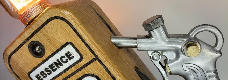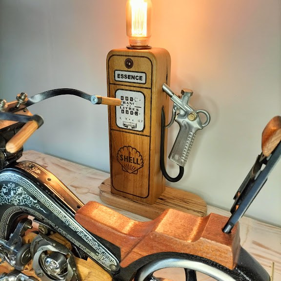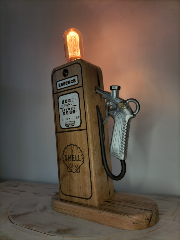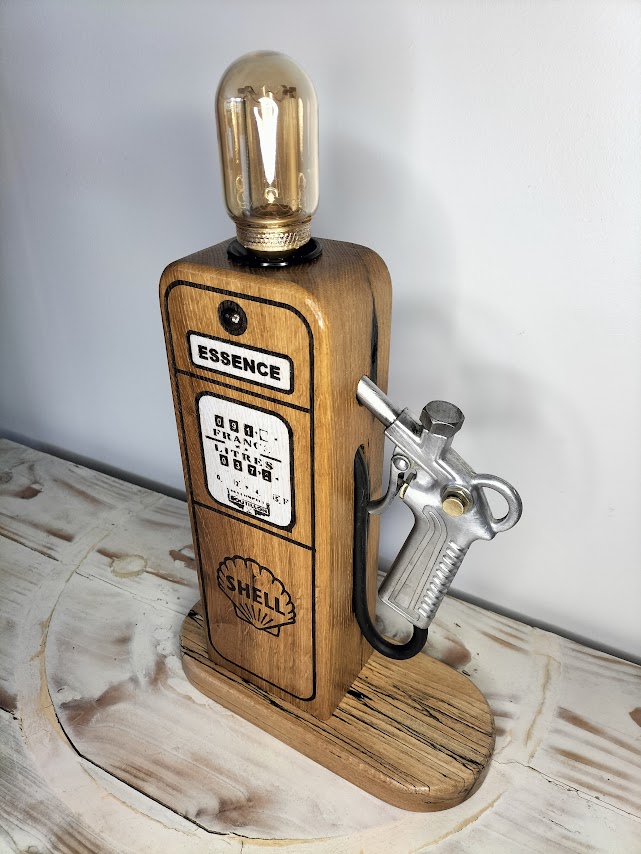 Chêne, hêtre échauffé, pistolet métallique et beaucoup d’huile de coude, tout est là pour créer une borne à essence lumineuse.