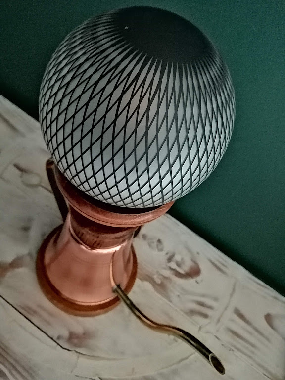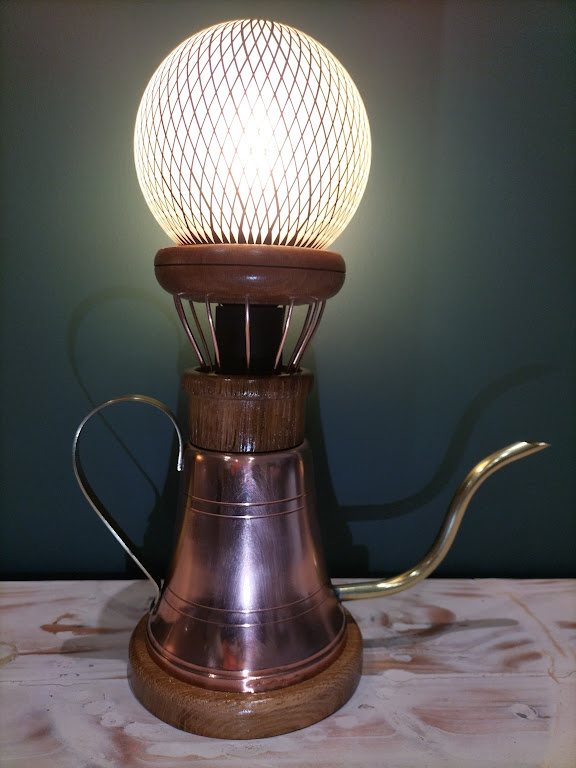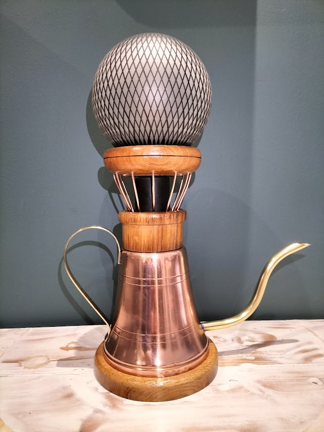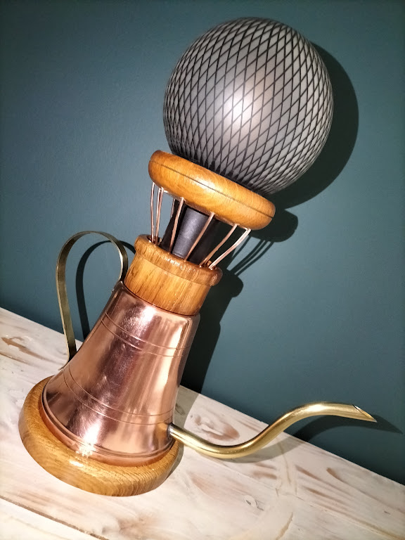 La base est un petit arrosoir en cuivre surmonté d’une structure en chêne et cuivre recyclés.
