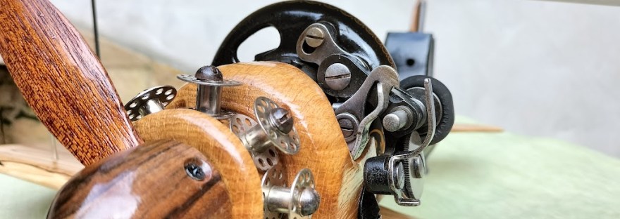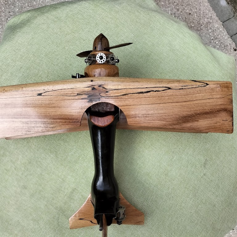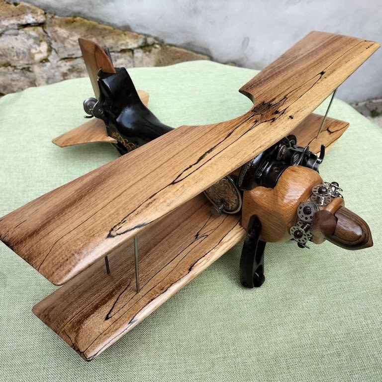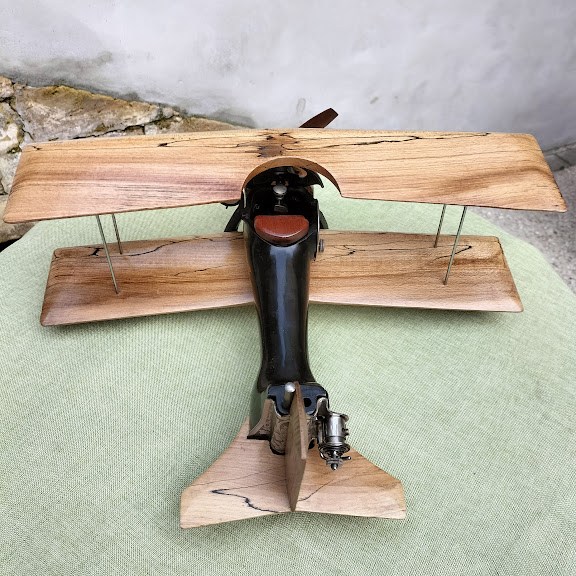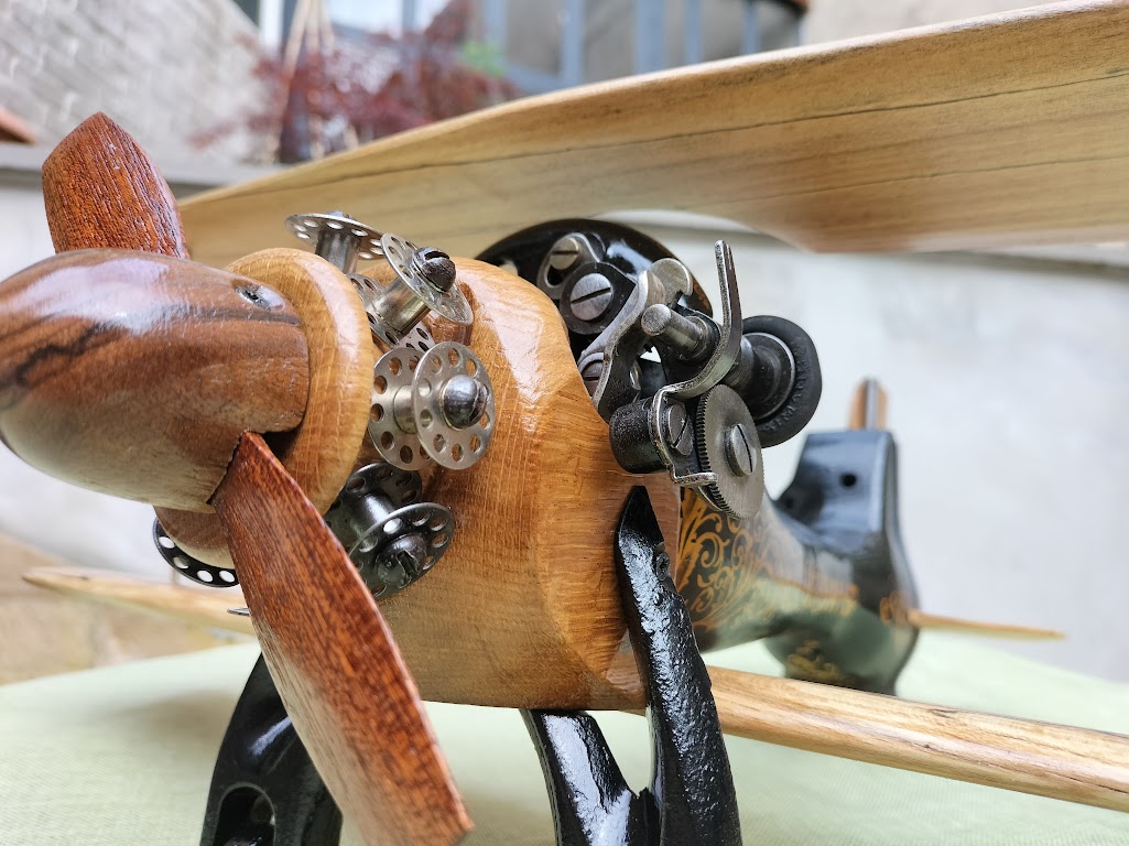 Ce biplan est réalisé à partir d’une ancienne machine à coudre, de ses accessoires et de bois recyclé.