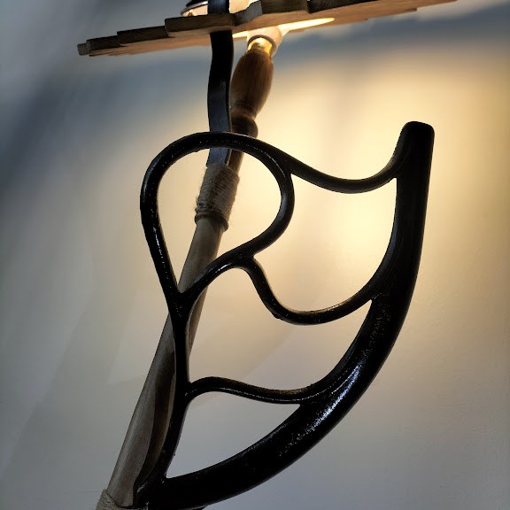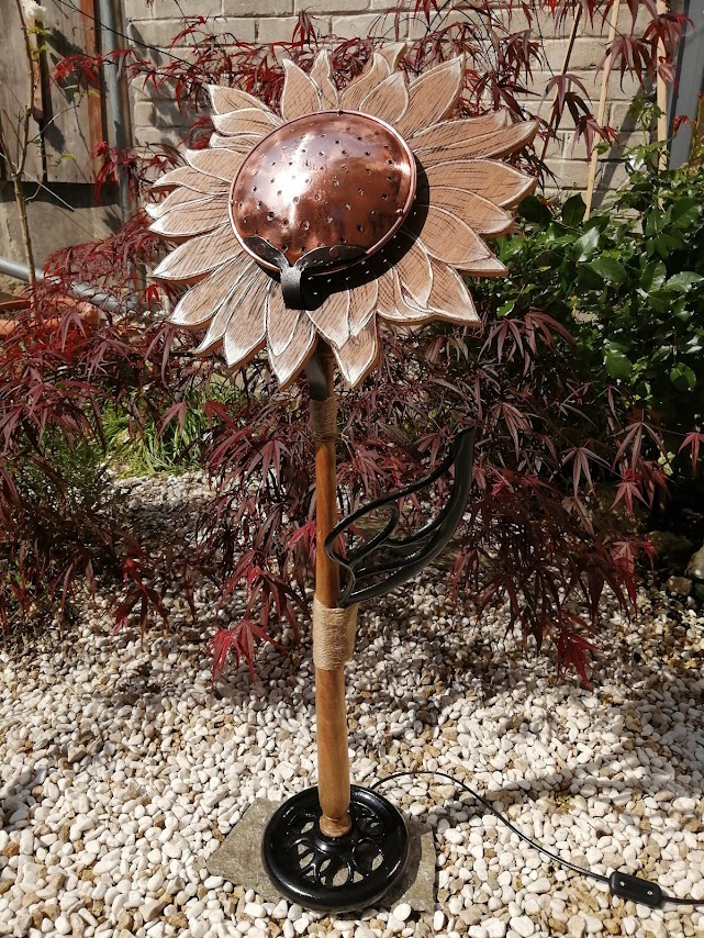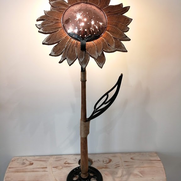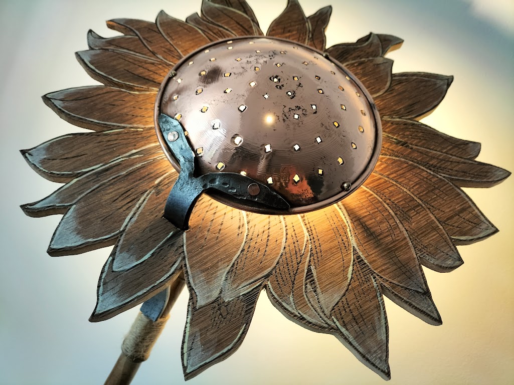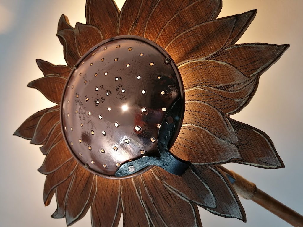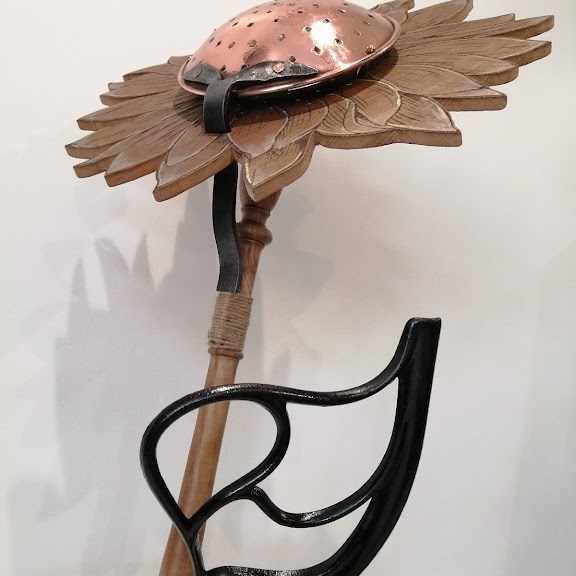 Son cœur est une écumoire en cuivre, ses pétales sont en bois, sa feuille est un protège courroie de machine à coudre, sa tige est un barreau d’escalier et le tout repose sur un volant de machine à coudre industrielle.