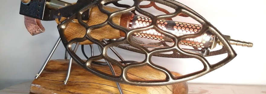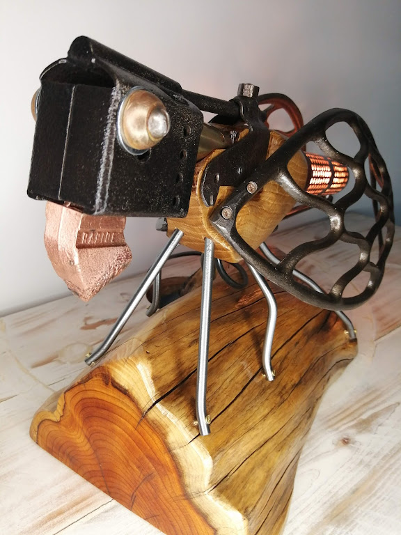 Posée sur un morceau d’if de Meuse, la voici avec ses ailes en protège-courroie de machine à coudre, ses pattes métalliques et sa flamboyante queue.