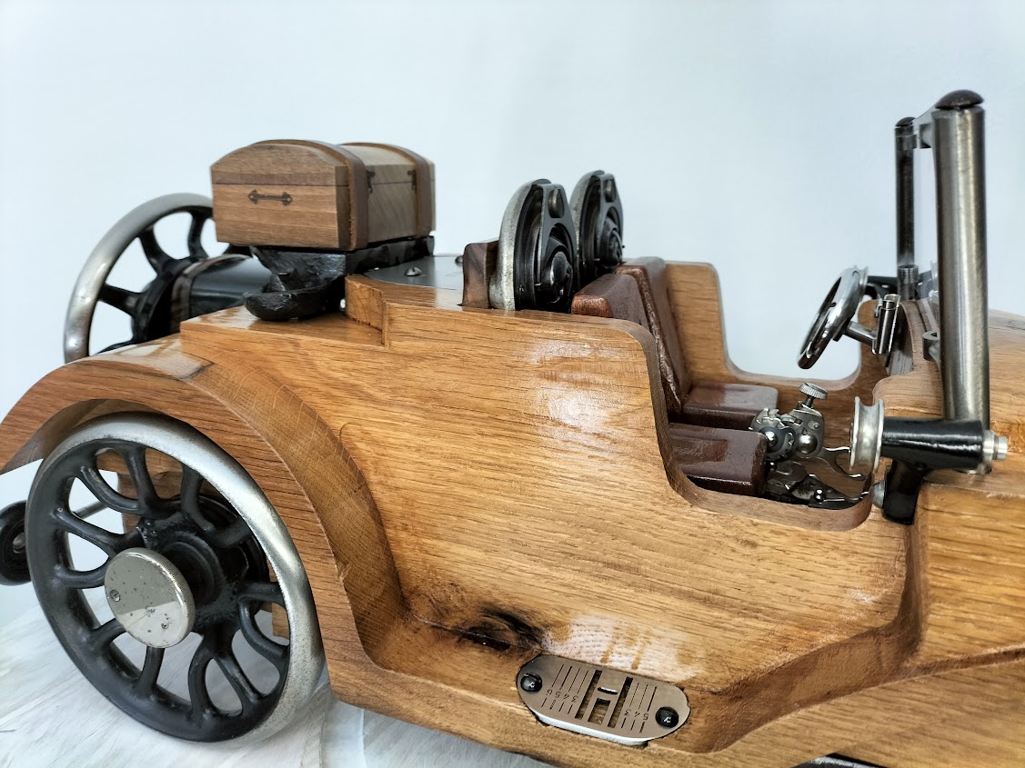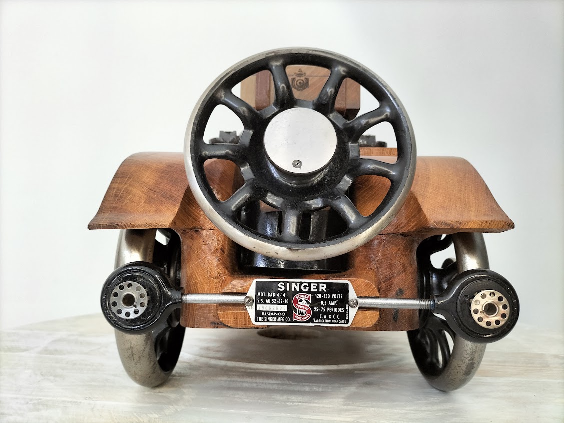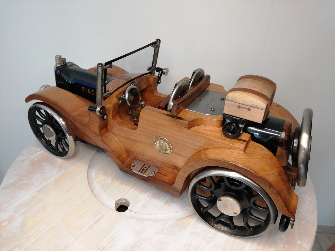 Créée à partir d’une machine à coudre Singer et de bois recyclé( poutre en chêne et noyer), cette voiture aux dimensions généreuses( Longueur: 67 cm, largeur: 25 cm , hauteur 29 cm et poids: 19,8 kg) possède tous les accessoires d’une grande.