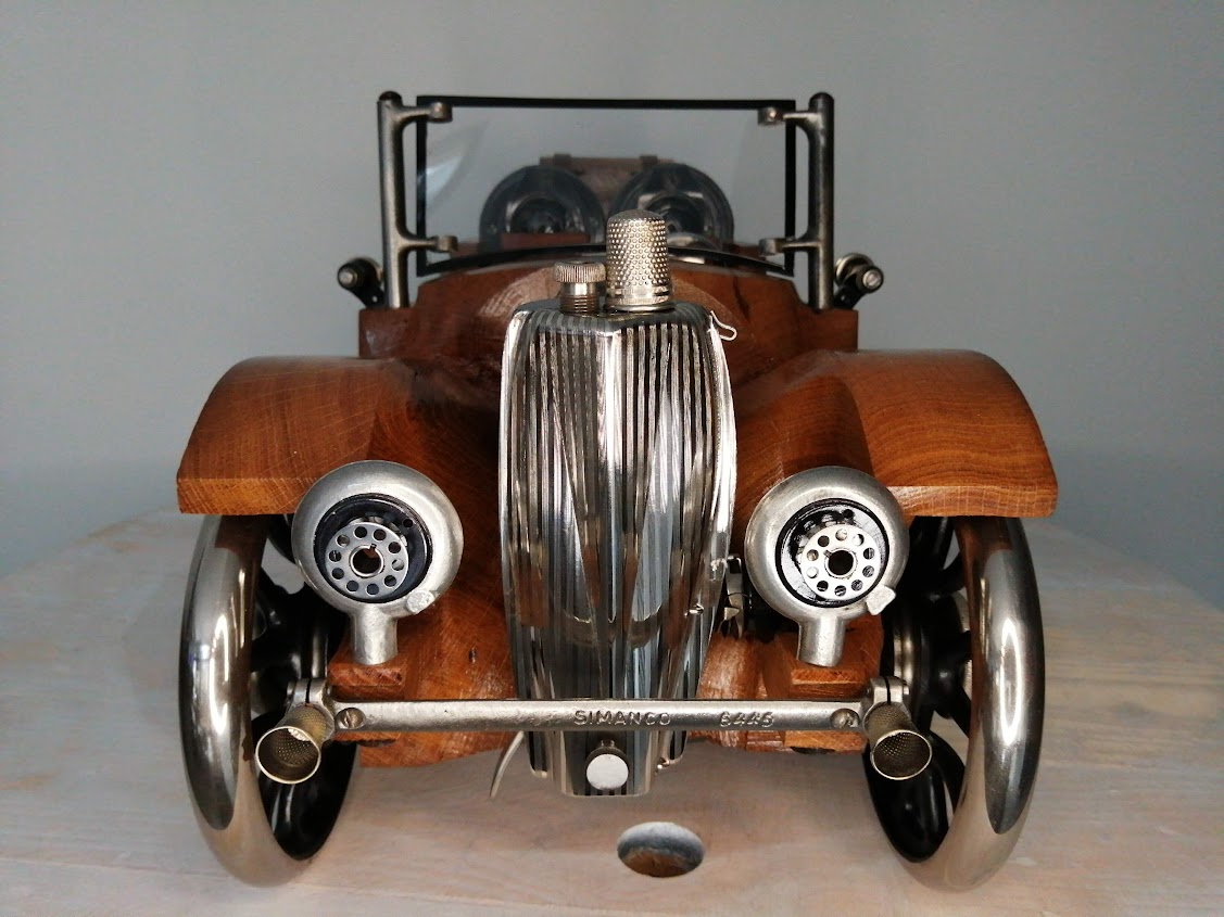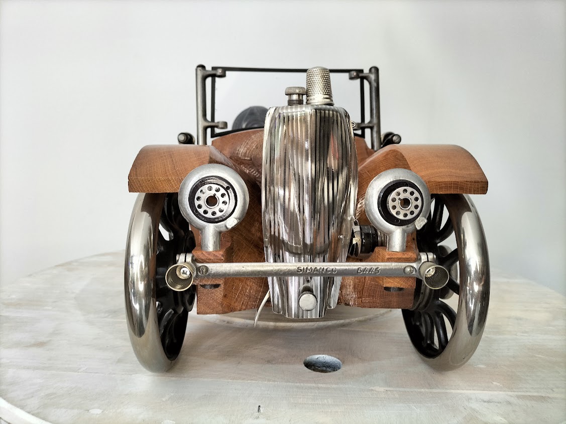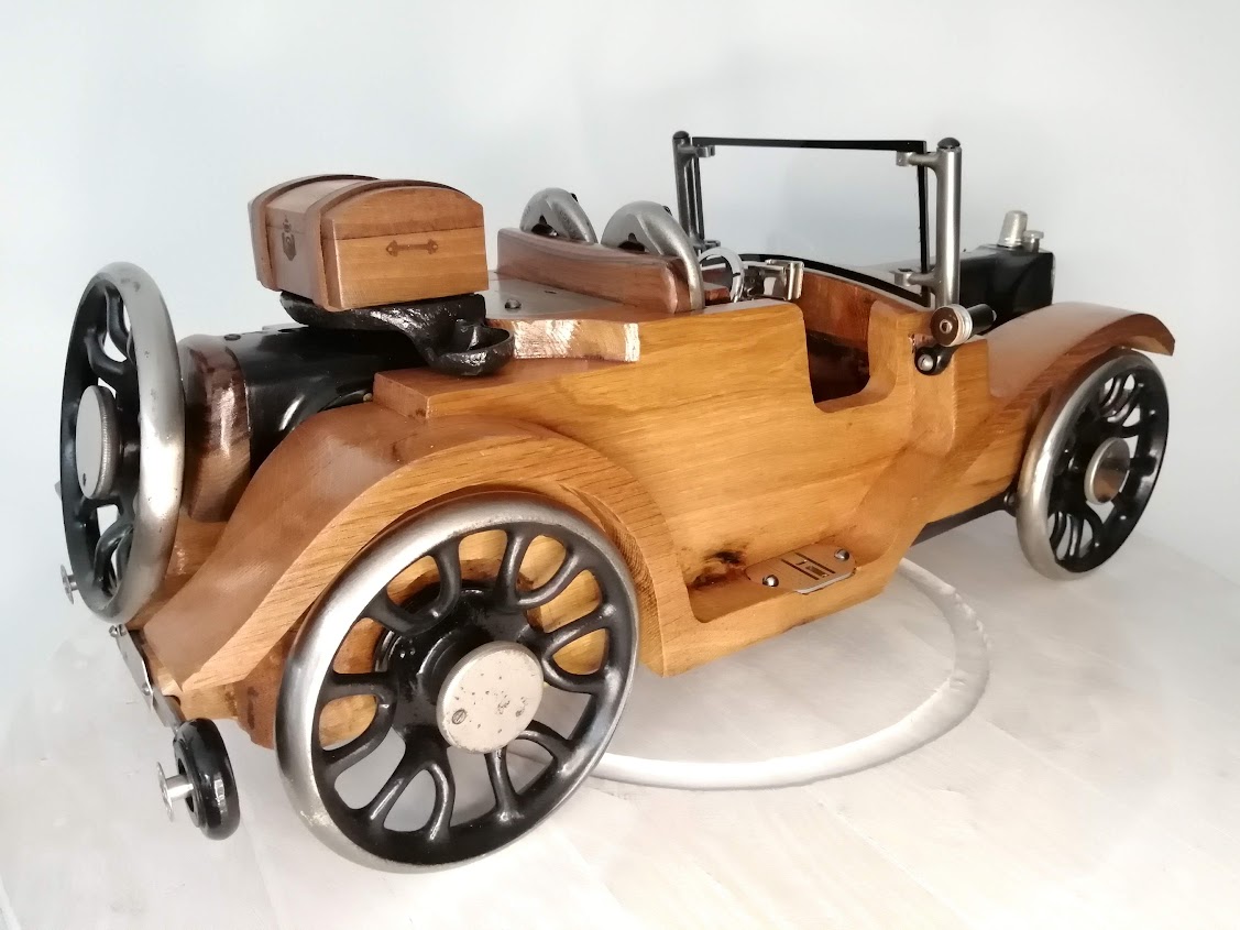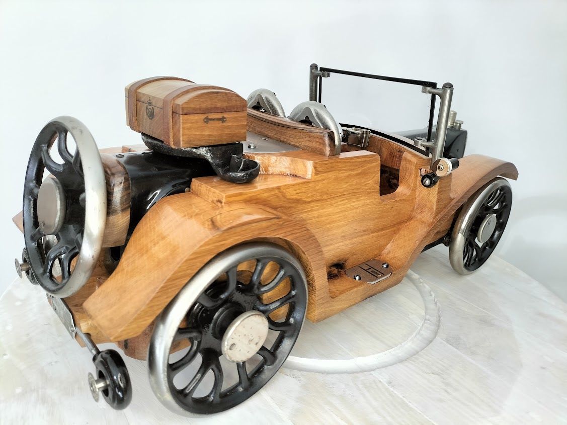 Créée à partir d’une machine à coudre Singer et de bois recyclé( poutre en chêne et noyer), cette voiture aux dimensions généreuses( Longueur: 67 cm, largeur: 25 cm , hauteur 29 cm et poids: 19,8 kg) possède tous les accessoires d’une grande.