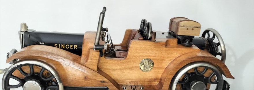 Créée à partir d’une machine à coudre Singer et de bois recyclé( poutre en chêne et noyer), cette voiture aux dimensions généreuses( Longueur: 67 cm, largeur: 25 cm , hauteur 29 cm et poids: 19,8 kg) possède tous les accessoires d’une grande.