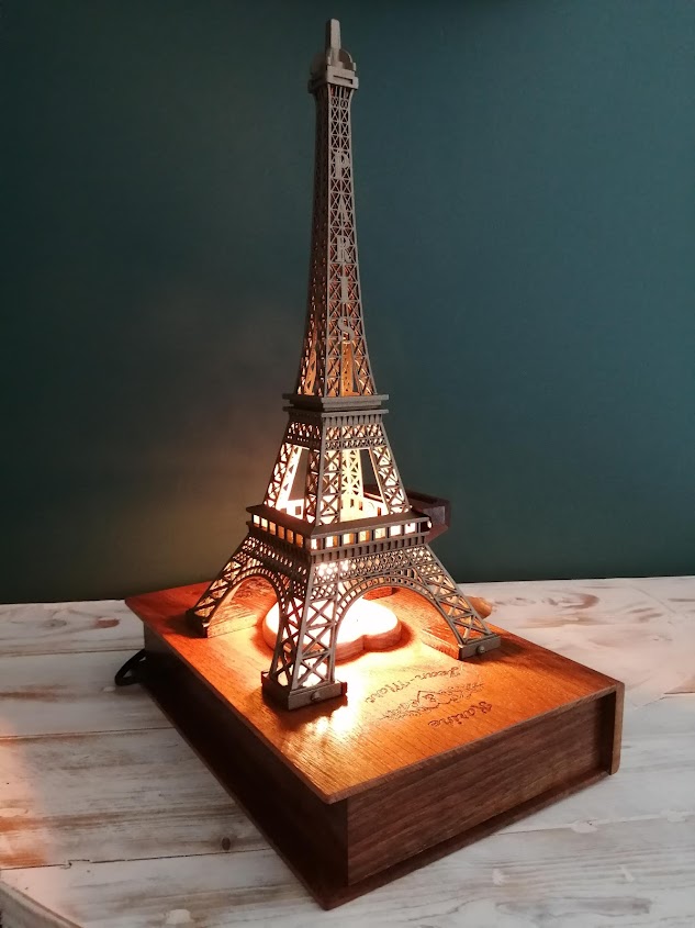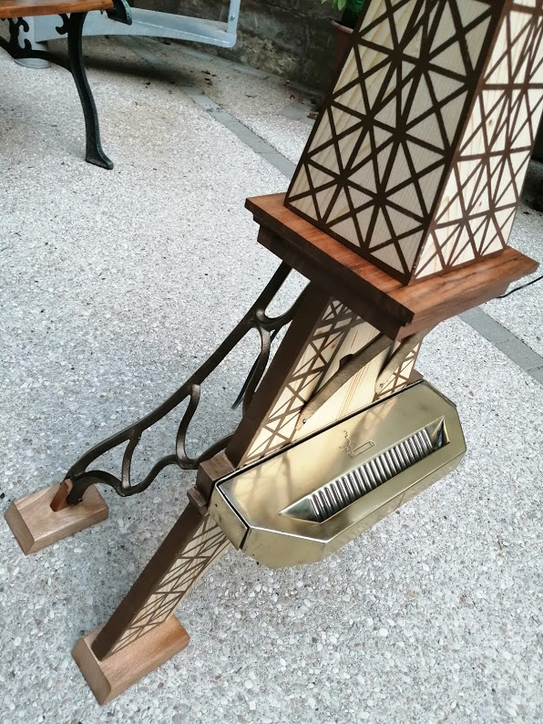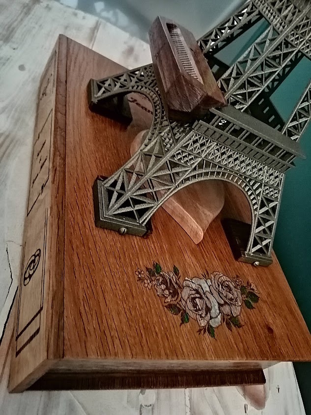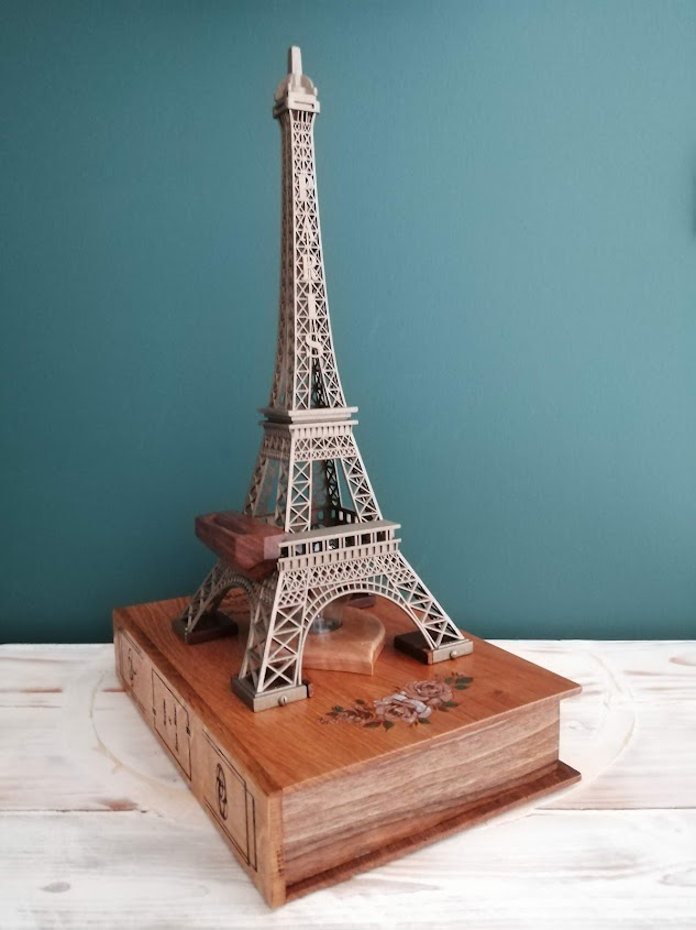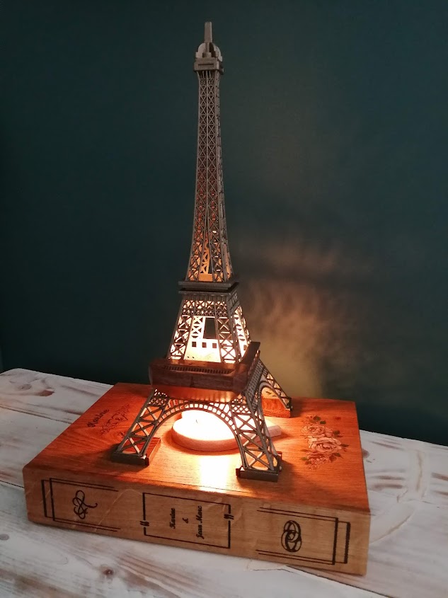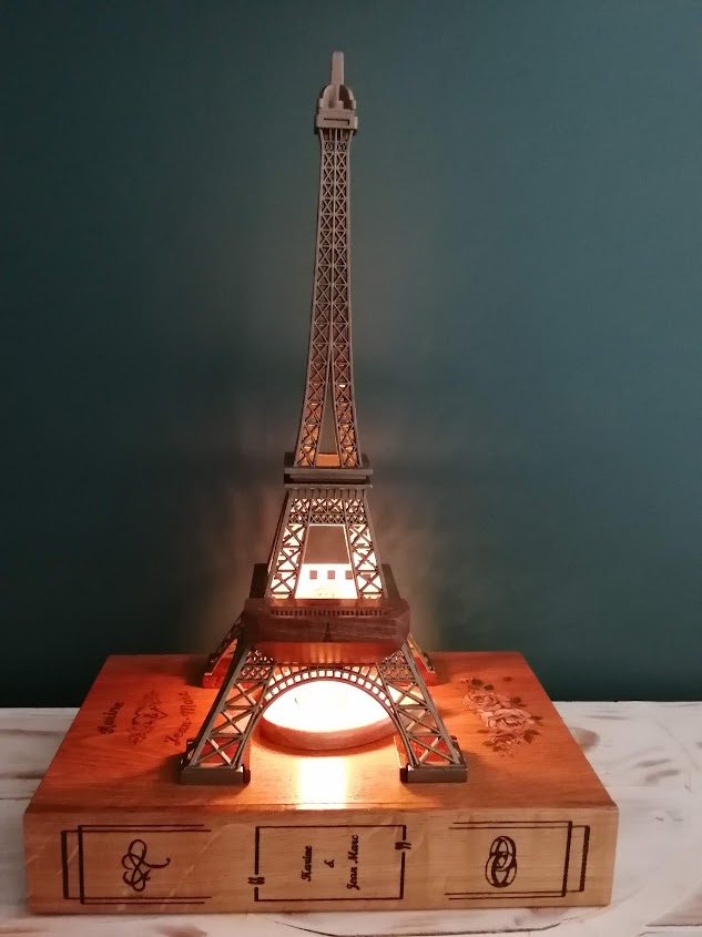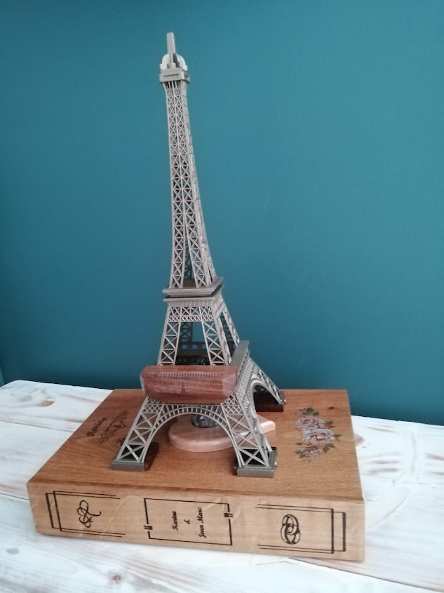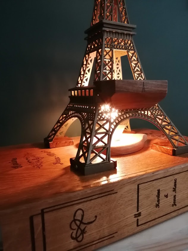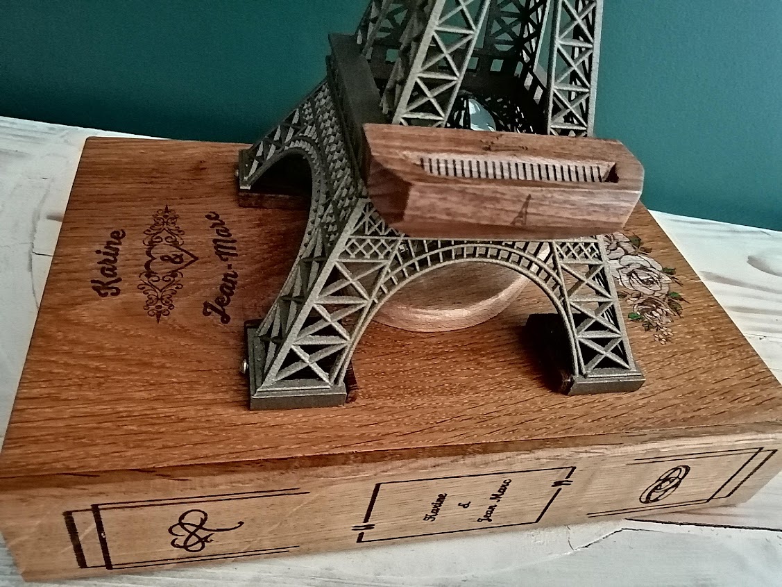 Nous avons donc repris le thème de la Dame de fer avec un cendrier à l’identique mais en bois. L’ensemble est posé sur un faux livre en chêne et noyer recyclé gravé aux noms des amoureux.
