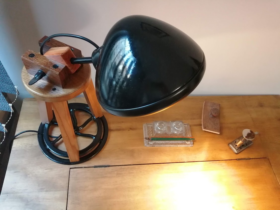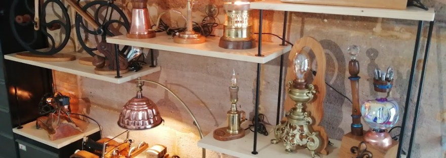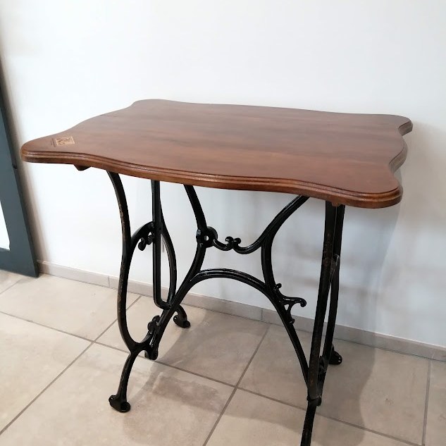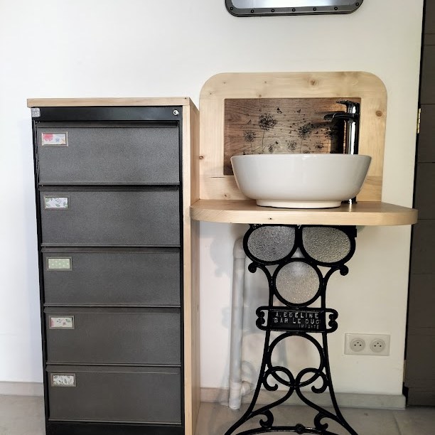 Pour les transformations de pieds de machine à coudre, nous créons actuellement les tables pour le salon de thé du musée de la machine à coudre de Châlons en Champagne et puis, il y a aussi notre meuble vasque: