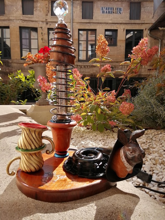 Lampe au Pays des Merveilles octobre 14, 2023 latelierbarisien Un lapin qui sort d’un vieux klaxon de tacot, des tasses en cuivre qui s’empilent et une lampe ressort, vous voilà dans un univers totalement décalé. Dimensions: hauteur 43 cm Partager :Tweet Cliquez pour partager sur WhatsApp(ouvre dans une nouvelle fenêtre) WhatsApp Cliquer pour envoyer un lien par e-mail à un ami(ouvre dans une nouvelle fenêtre) E-mail J’aime chargement… Similaire Publié par latelierbarisien Voir tous les articles par latelierbarisien