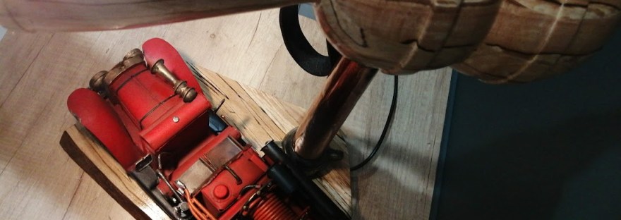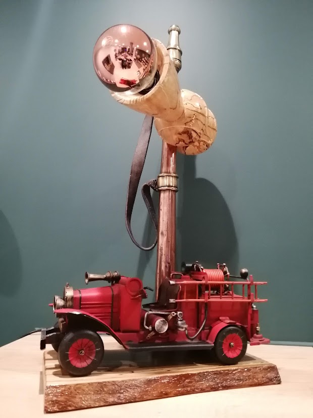 Nous avons associé, sur cette lampe, un vieux camion de pompier en tôle avec une authentique lance en cuivre avec sa lanière en cuir d’origine.