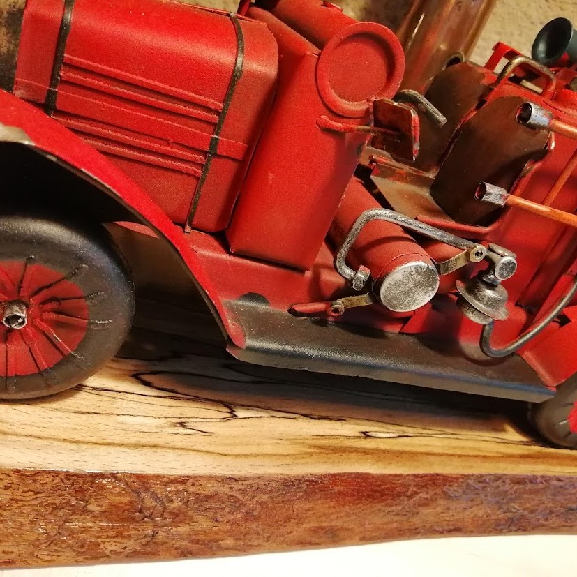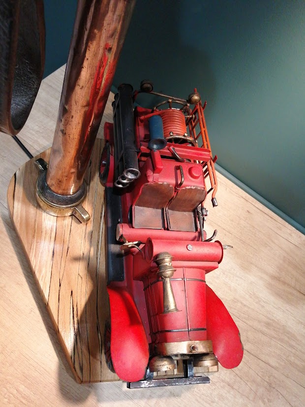Posé sur un plateau en hêtre échauffé, la lance sert de support à une sirène( dans le style de celle du camion) en hêtre abritant l’ampoule avec son déflecteur cuivré.