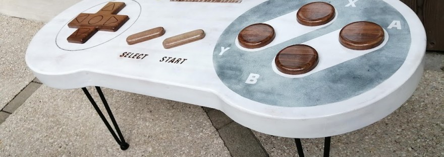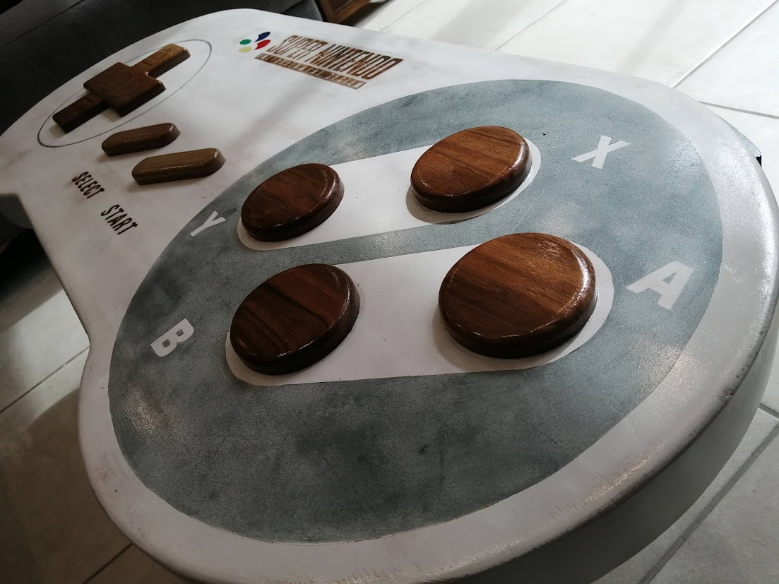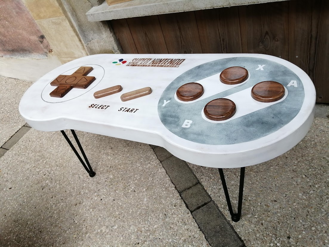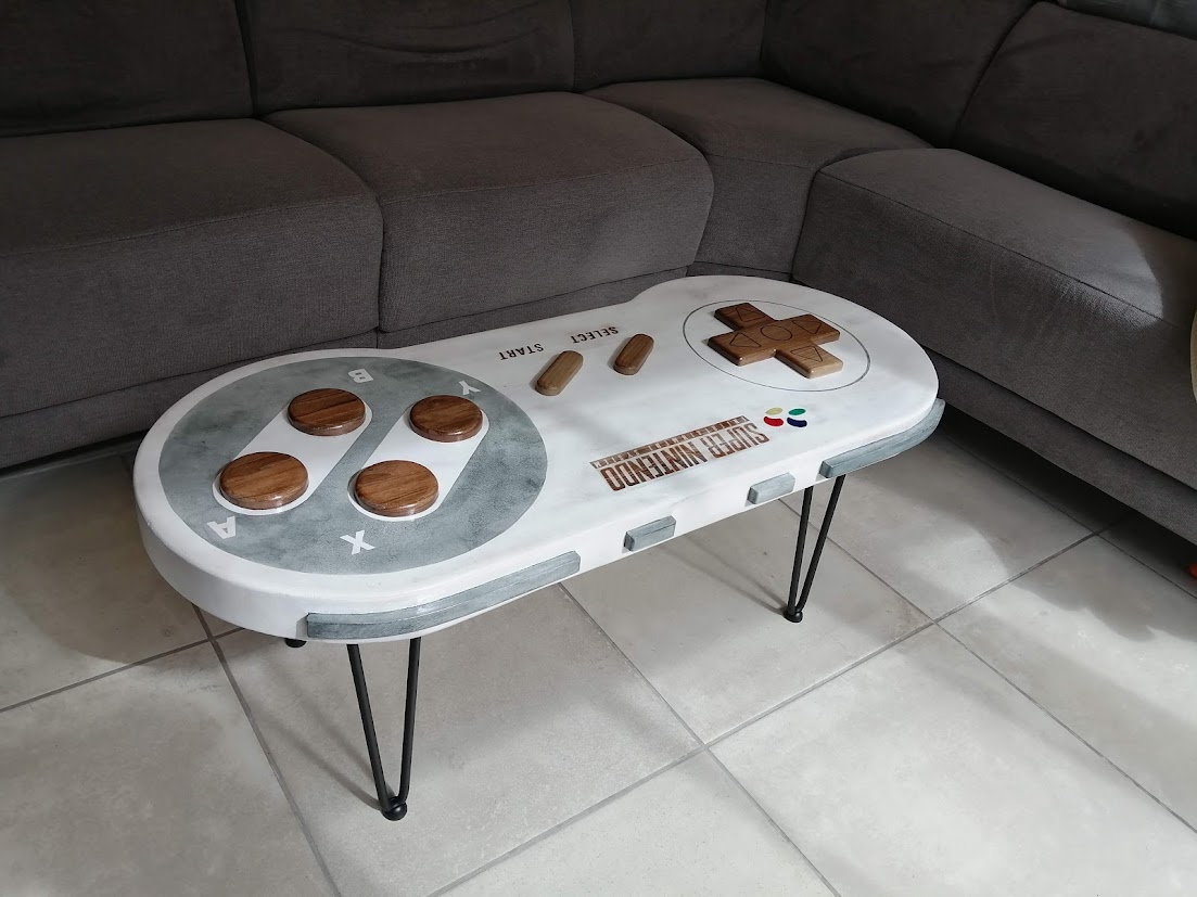 Notre Thomas a toujours été fan de jeux vidéo et il nous en a fait voir de toutes les couleurs avec ça. Alors, pour ses 30 ans, nous lui avons fait la surprise de lui créer une table de salon « manette de jeu ».