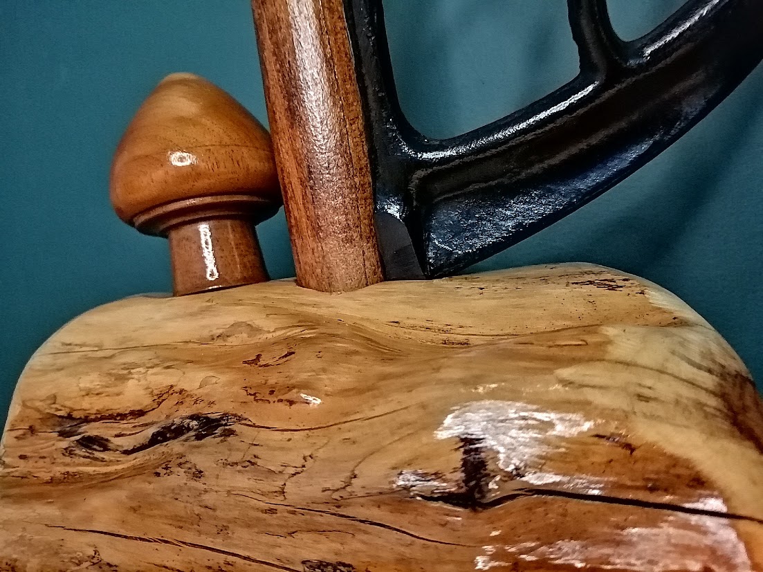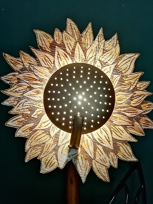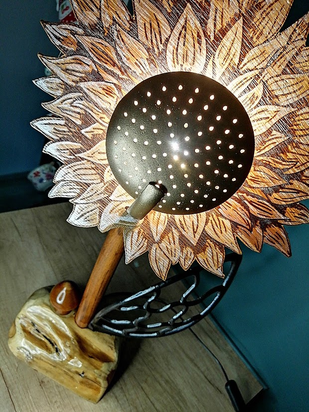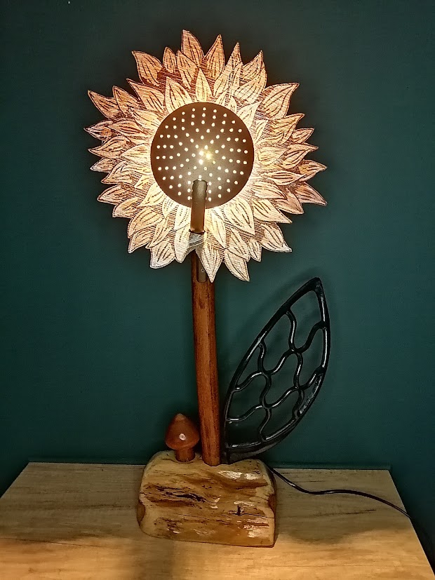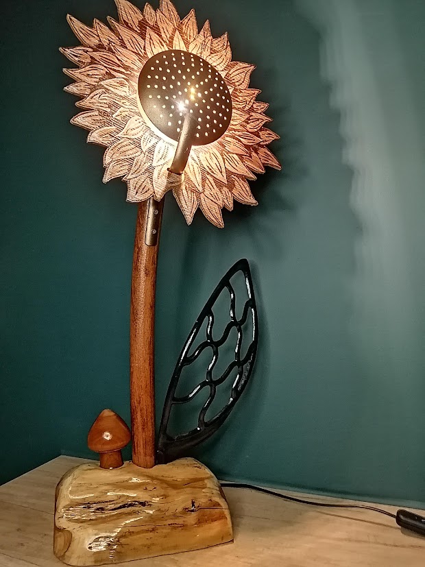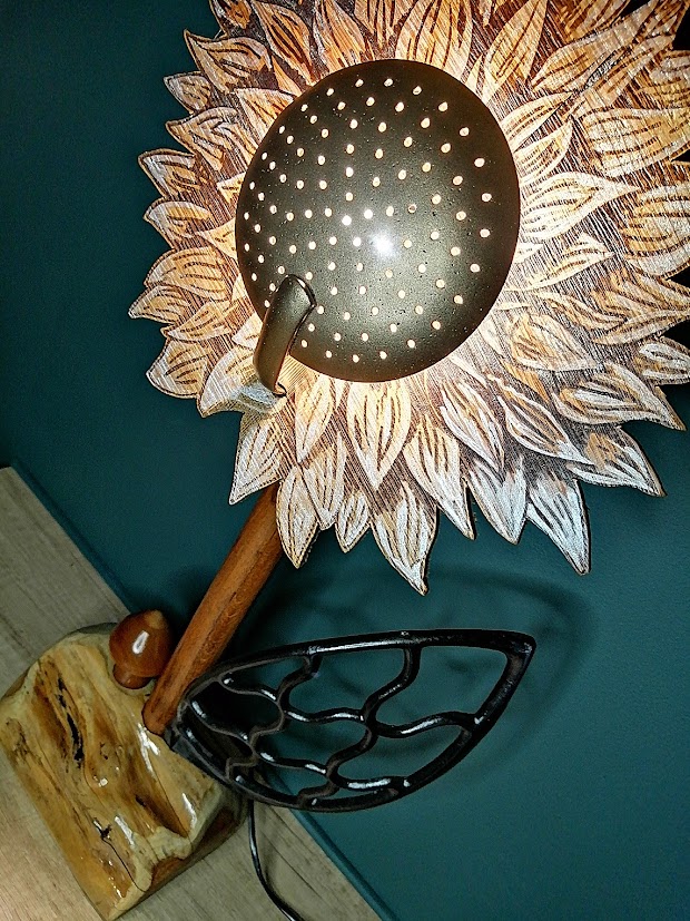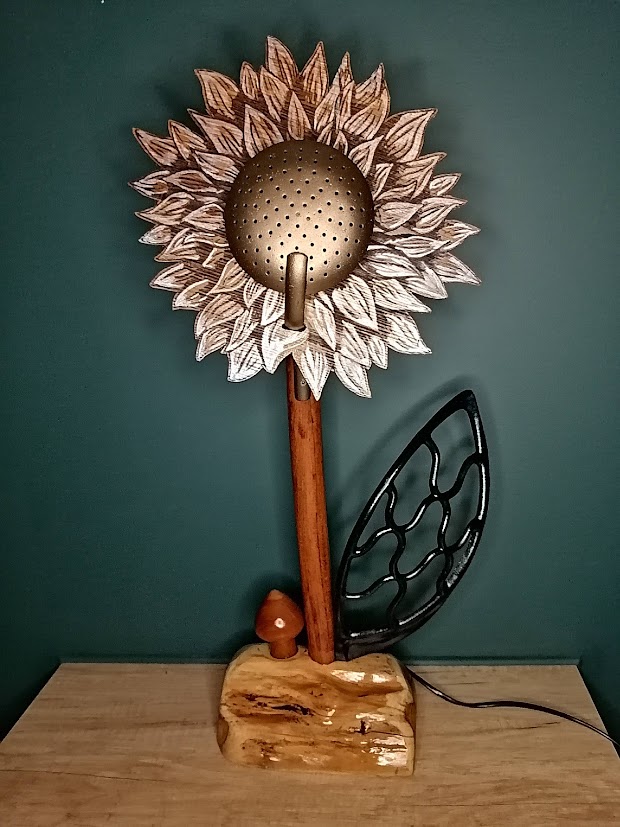 Posée sur un morceau d’if, cette fleur en bois upcyclé a la particularité d’avoir un coeur en écumoire et une feuille en fonte( protége courroie de machine à coudre) et pour voisin, un petit champignon