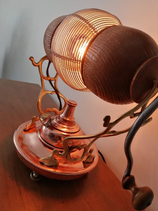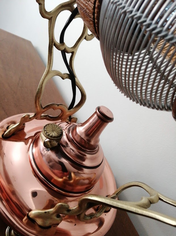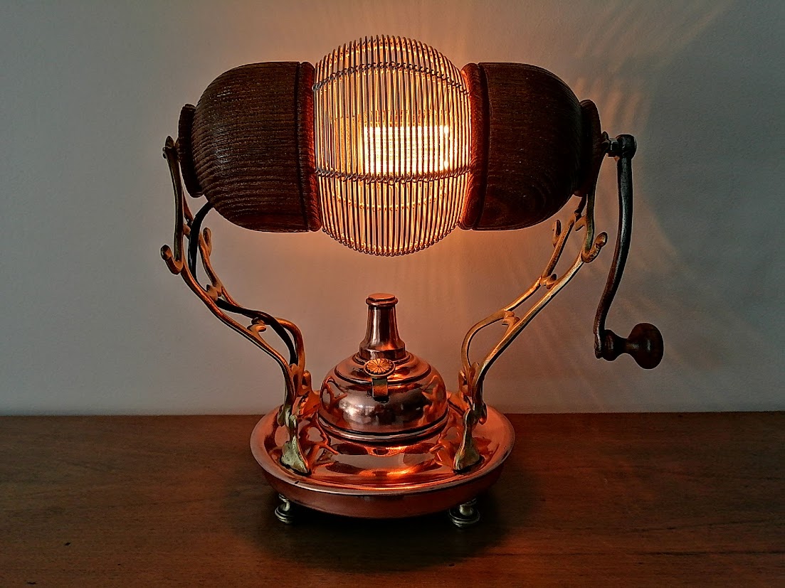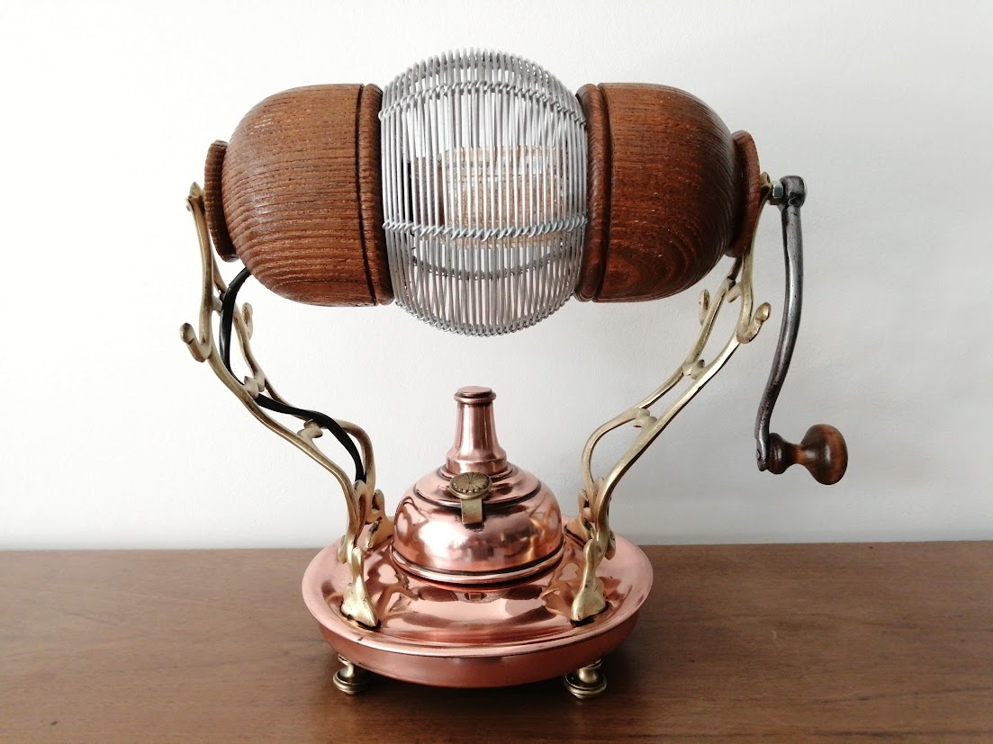 Sur une base de Samovar en cuivre, nous avons entrepris de créer cette nouvelle lampe dans l’esprit des appareils de torréfaction de café.