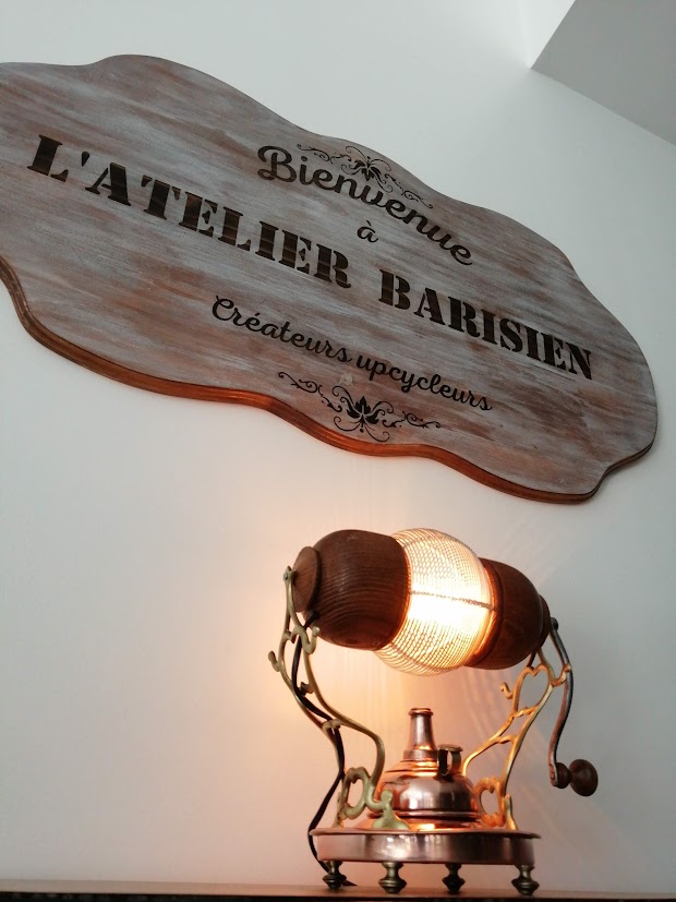 La partie haute est constituée de 2 morceaux de pieds de table en chêne et d’une boule grillagée d’un ancien lustre.