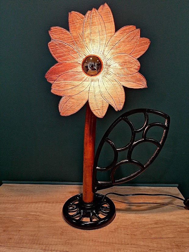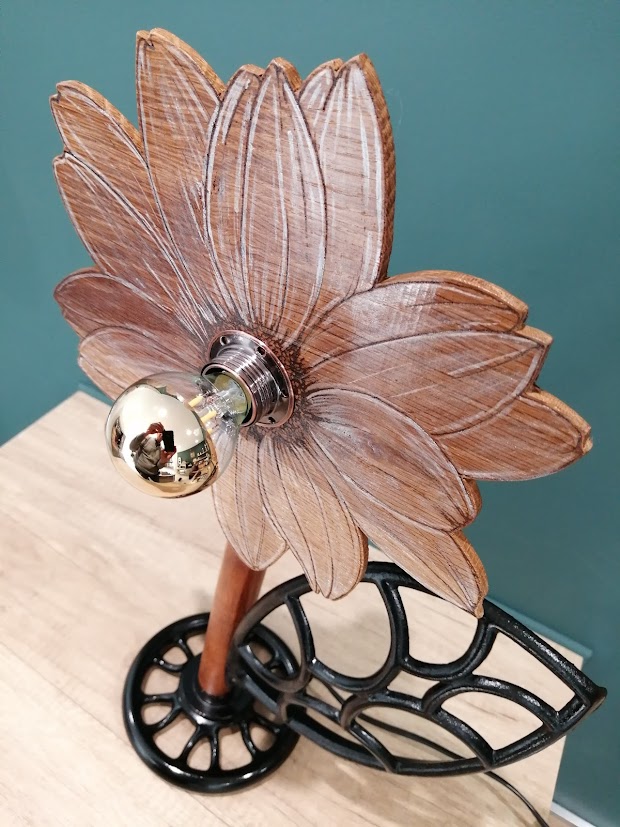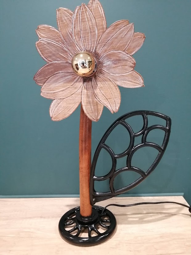 Posé sur un volant de machine à coudre, cette fleur en chêne va illuminer votre intérieur sans jamais fâner.