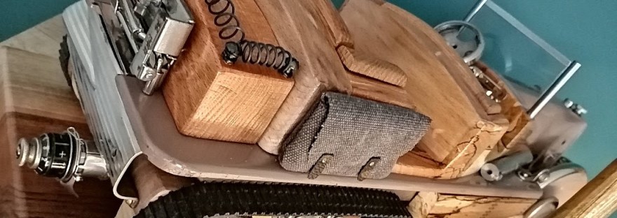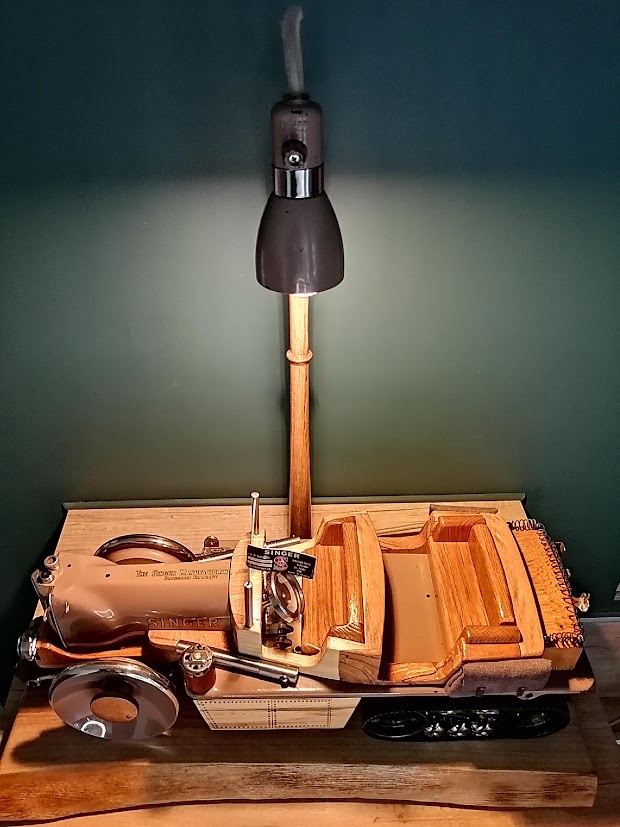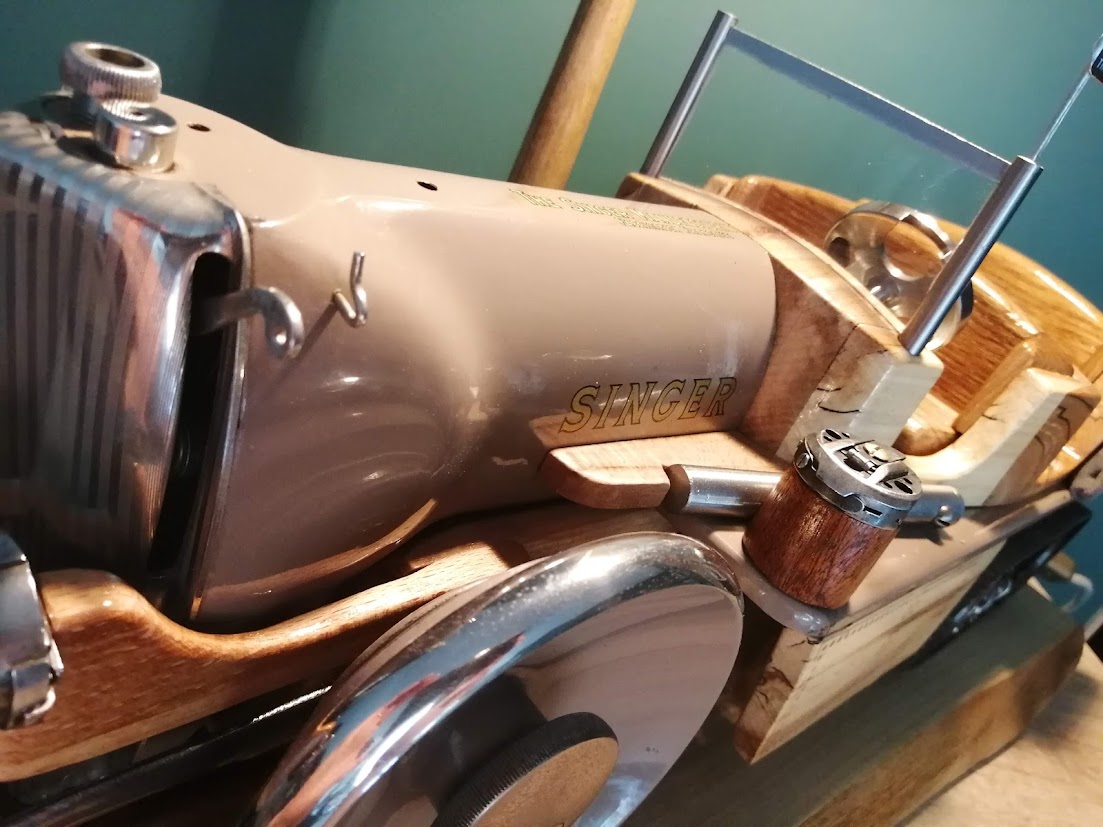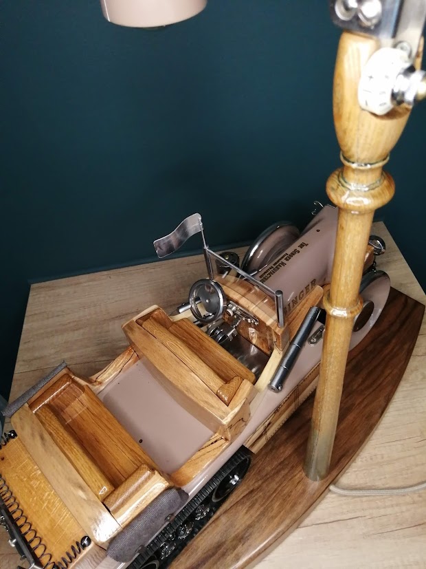 Le coloris de la machine à coudre Singer est d’origine et pour la sublimer, l’autochenille est posé sur une planche de noyer et réhaussée par un lampadaire créé à partir de la lampe de la machine.