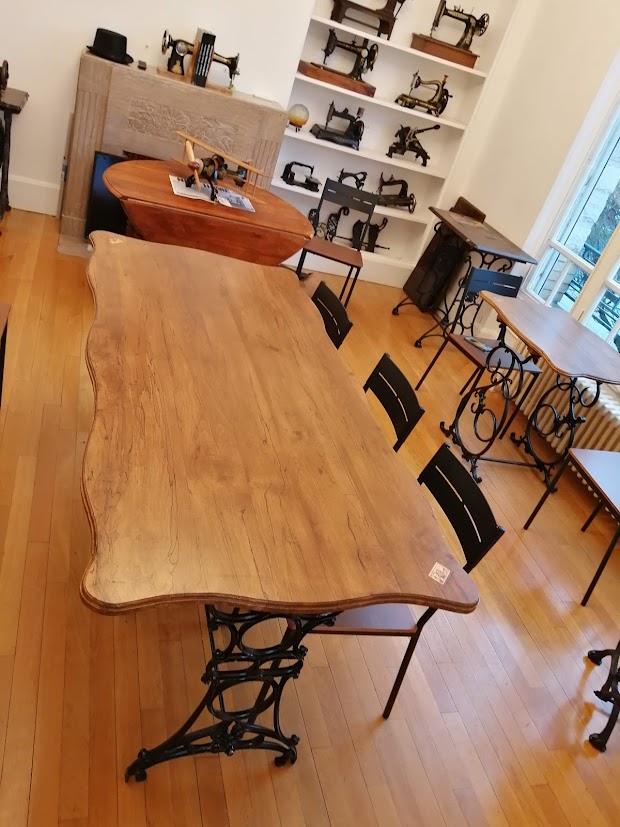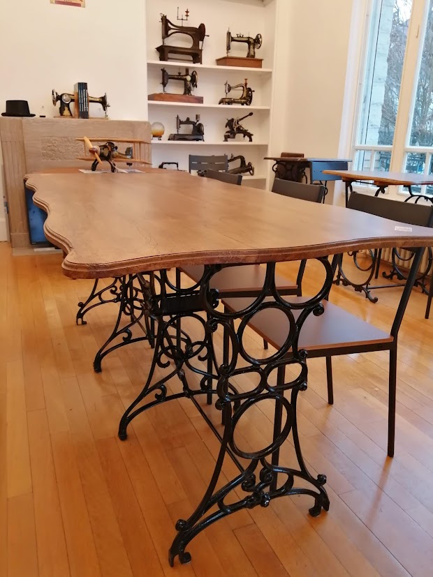 Pour le musée de la machine à coudre de Châlon en Champagne, une belle grande table familiale et de petites tables pour le salon de thé: