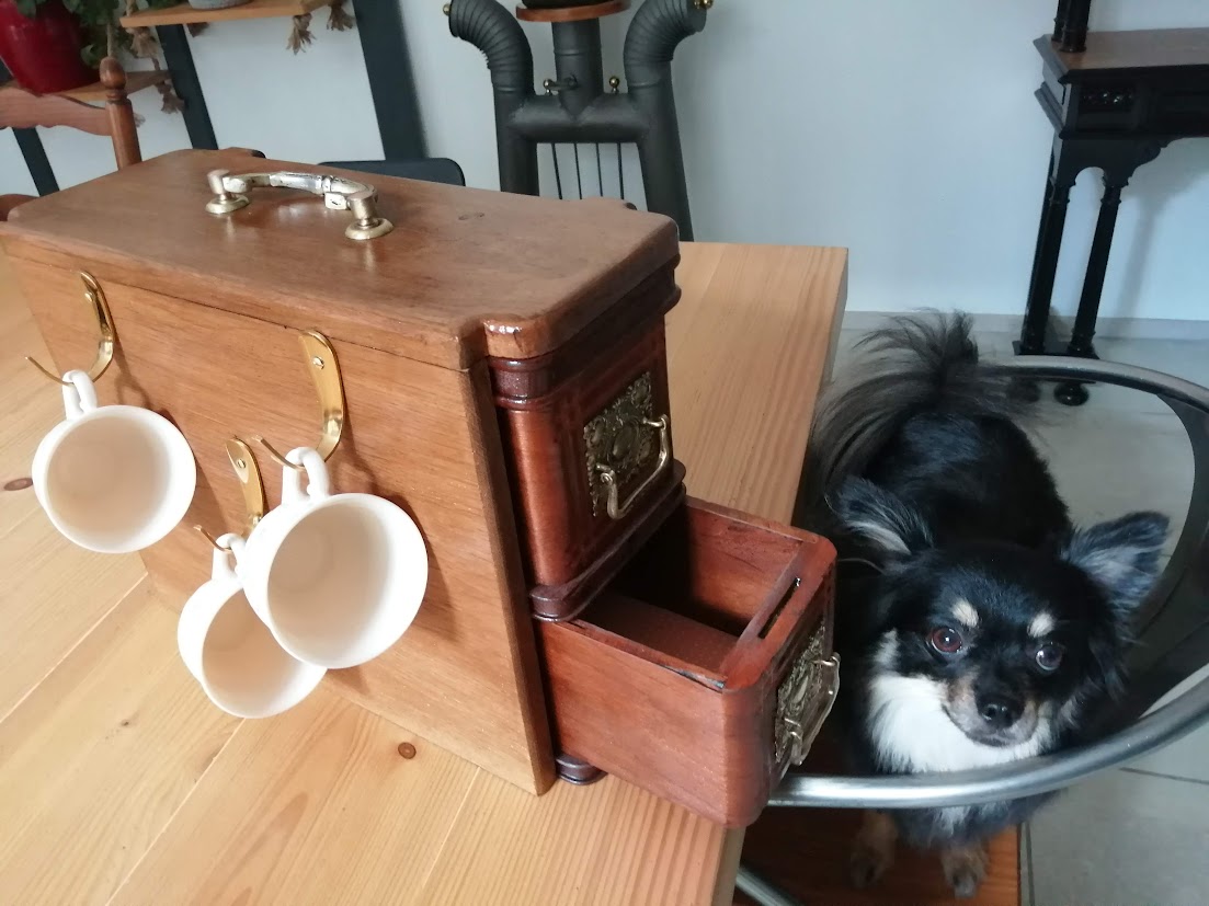 Sur le côté, nous y avons ajouté un panneau de chêne et 3 crochets dorés (des manches de cuillères présentés par Lulu 🙂 ) afin d’y suspendre vos tasses préférées ou vos accesoires de couture.