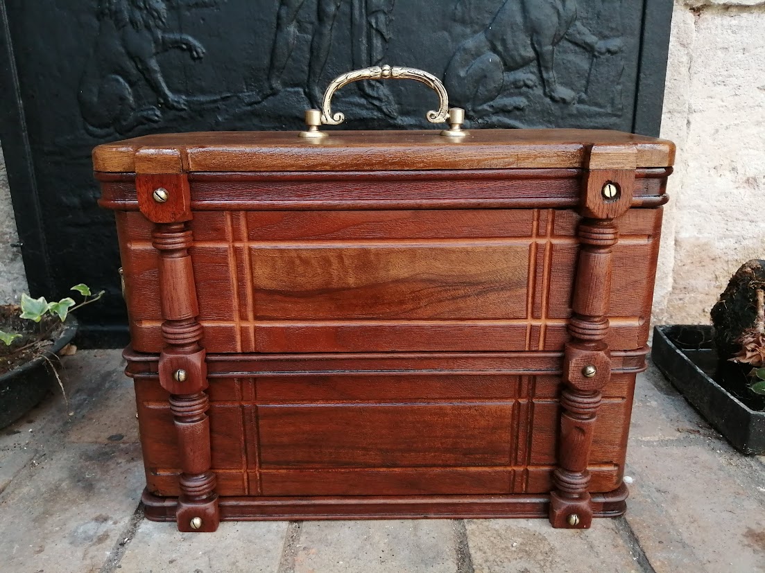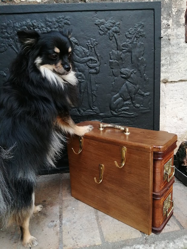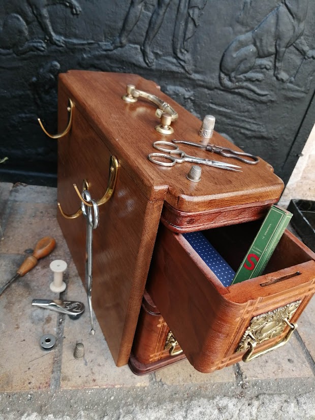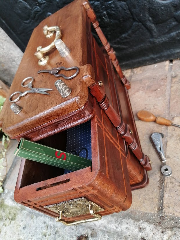 La poignée de transport provient d’un ancien capot de machine à coudre.