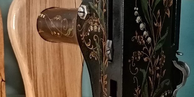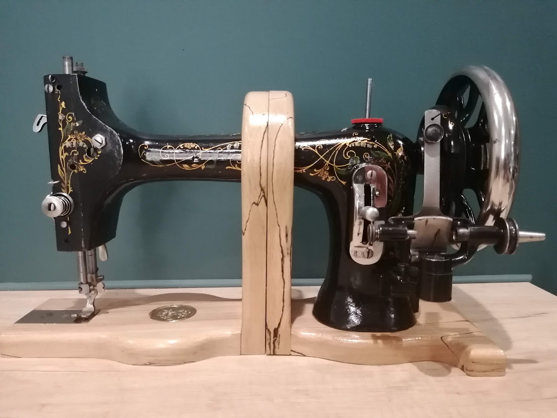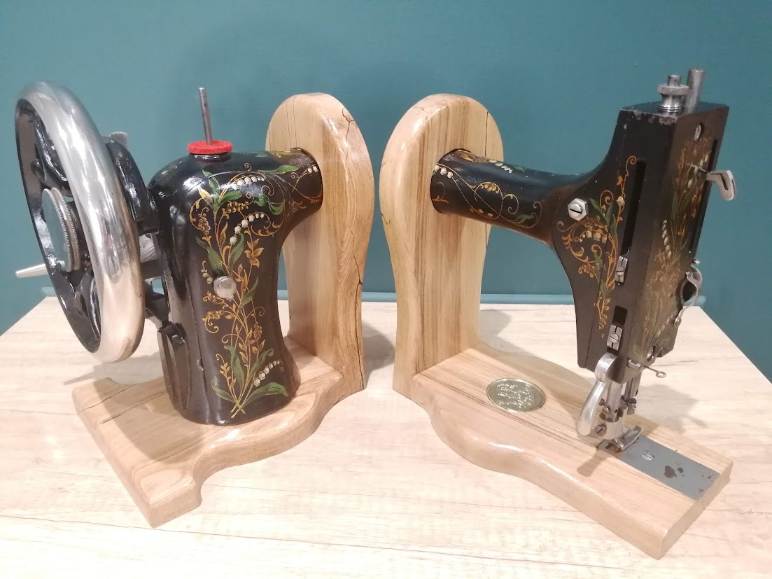 Posée sur 2 beaux supports en hêtre échauffé de Meuse, la machine à coudre fera sensation sur votre étagère. Vous noterez le petit médaillon Singer qui a été repositionné sur le support bois.