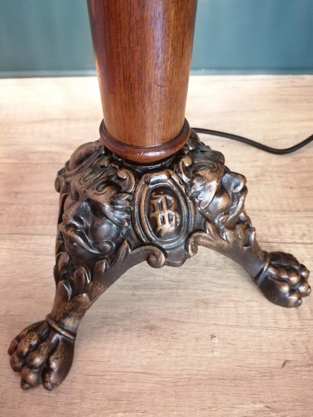 Une amie nous a donné un magnifique pied de globe terrestre Lebègue dont la base tripode en fonte est ornée de mascarons et de pieds griffe( la mappemonde s’était brisée aprés une chute)