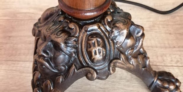 Une amie nous a donné un magnifique pied de globe terrestre Lebègue dont la base tripode en fonte est ornée de mascarons et de pieds griffe( la mappemonde s’était brisée aprés une chute)