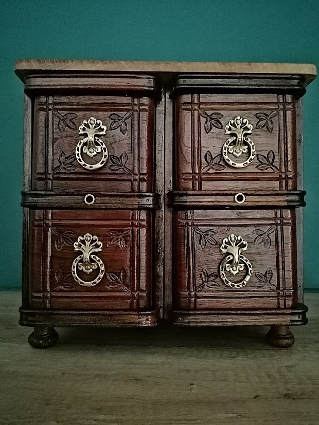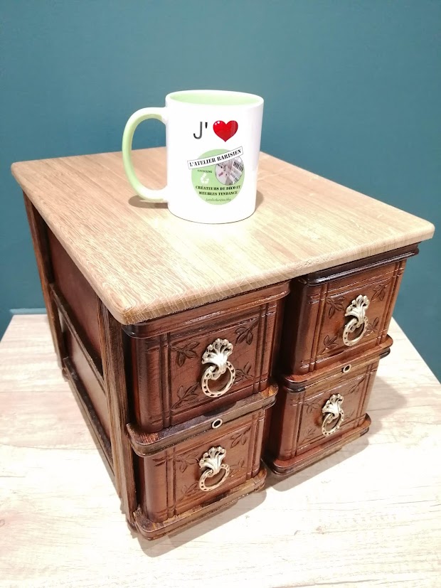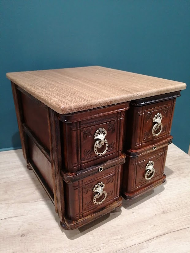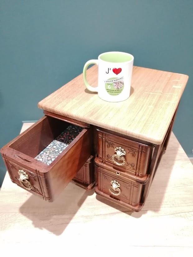 Sur certaines tables de machine à coudre peuvent se trouver de ravissants tiroirs…Ils sont si beaux qu’ils nécessitent juste un bon nettoyage, un joli plateau de chêne et 4 petits pieds de récup’ pour vivre leur meilleure seconde vie