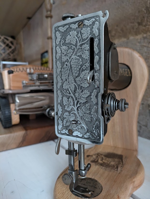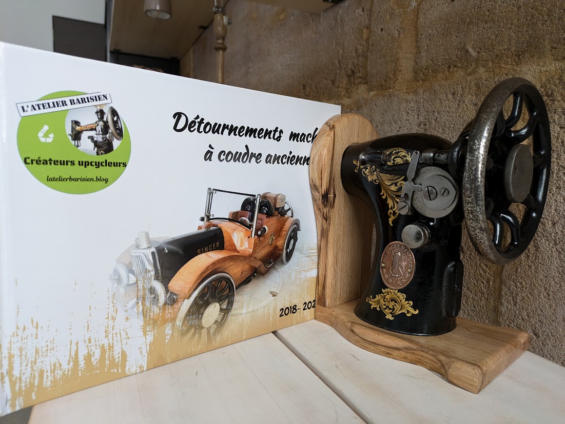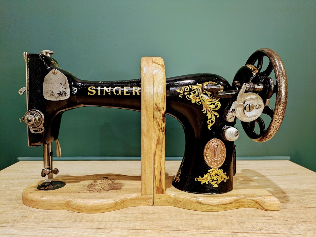 Nouveau serre-livres réalisé à partir d’une machine à coudre Singer avec une gravure représentant une couturière.