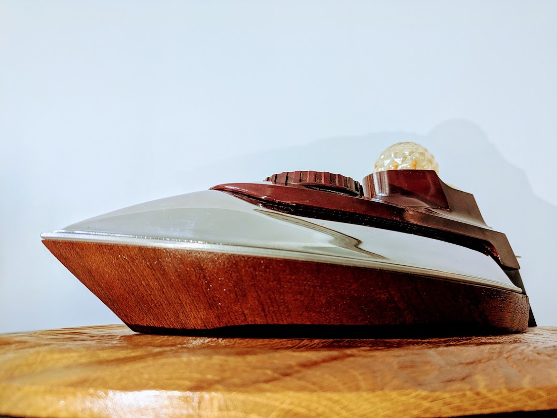 Placé sur un plateau en chêne travaillé aspect vagues, le fer s’est métamorphosé en Offshore de compétition avec sa ligne élancée et sa coque en bois exotique.