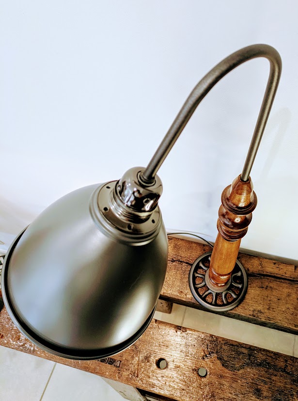 Surplombant l’ensemble, un globe , sa douille design en métal et son long tube en cuivre courbé et peint.