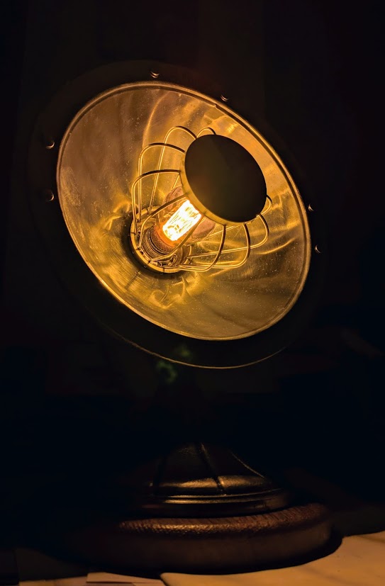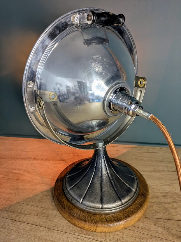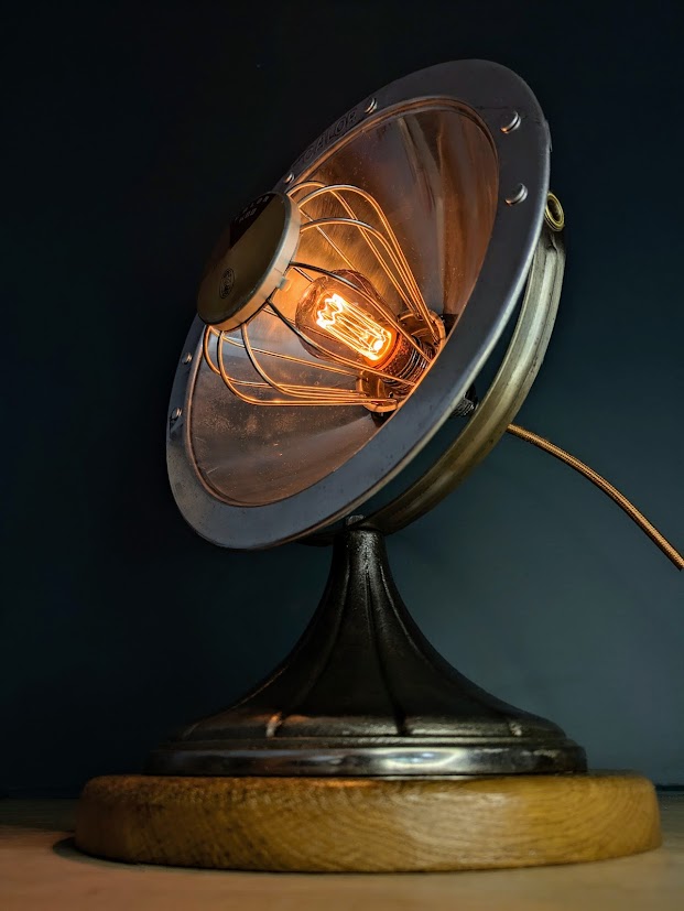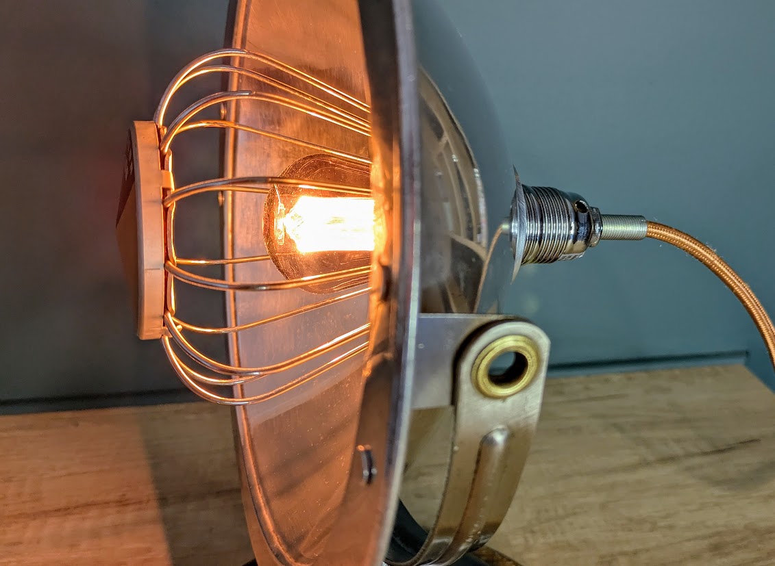 Aprés un bon nettoyage, la résistance a été retirée au profit d’une belle douille en métal chromé et d’une ampoule LED à filaments. Pour l’électrifier, nous lui avons mis un fil en corde couleur cuivre pour rappeler le coloris du socle en bois et du médaillon central.