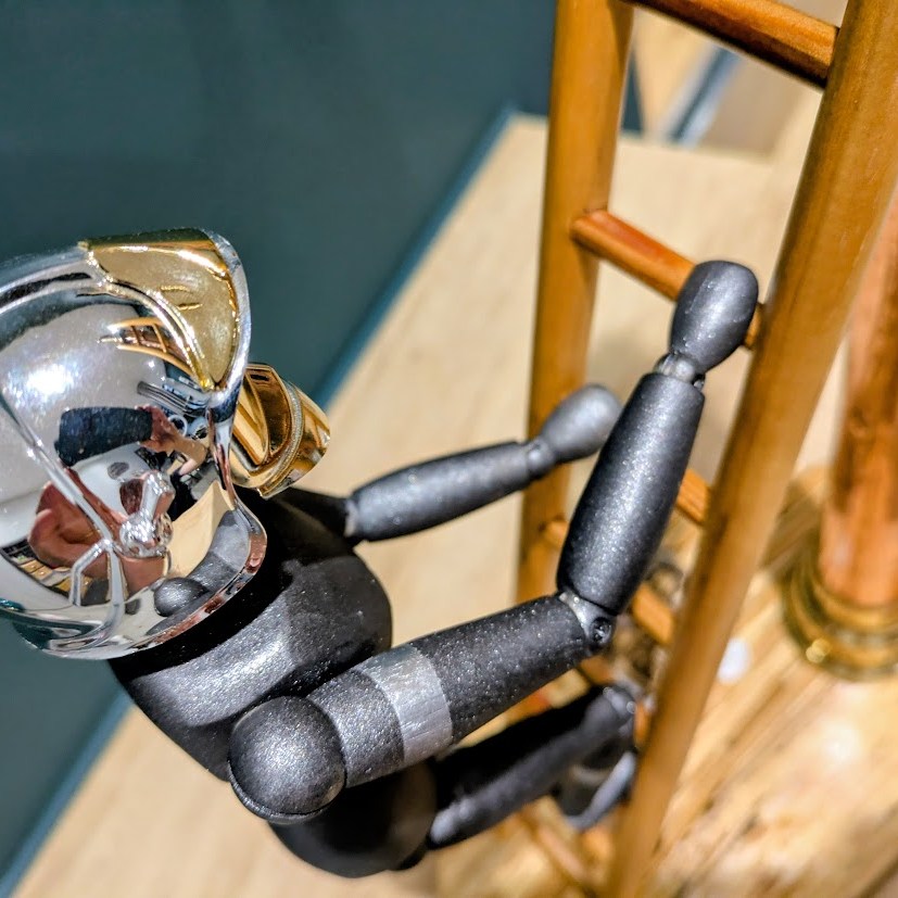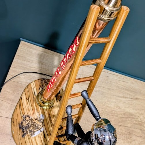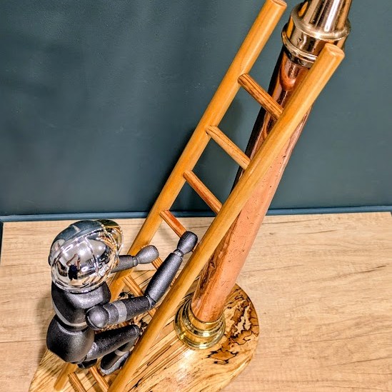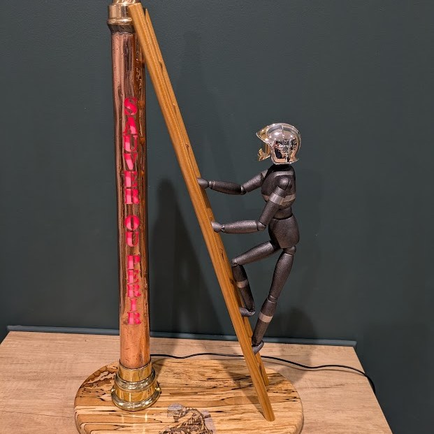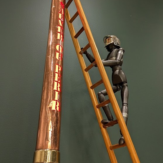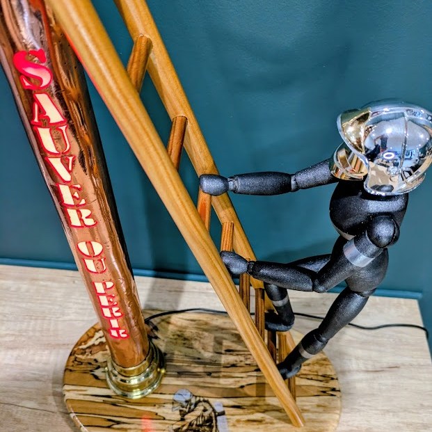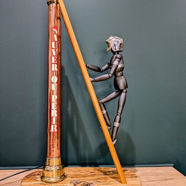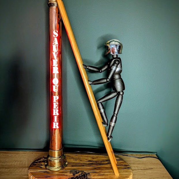 Une échelle en bois, un socle en hêtre échauffé, un mannequin articulé en bois et un petit casque F1 de pompier pour réaliser une belle mise en scène … voici « La lance du Sapeur » prête à sublimer votre intérieur.