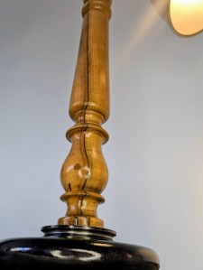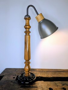 Posée sur son volant de machine à coudre, ce magnifique barreau de chaise est surplombé par un abat jour métallique.