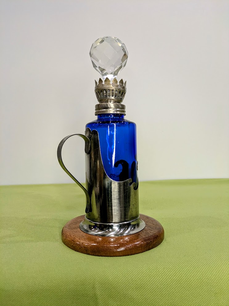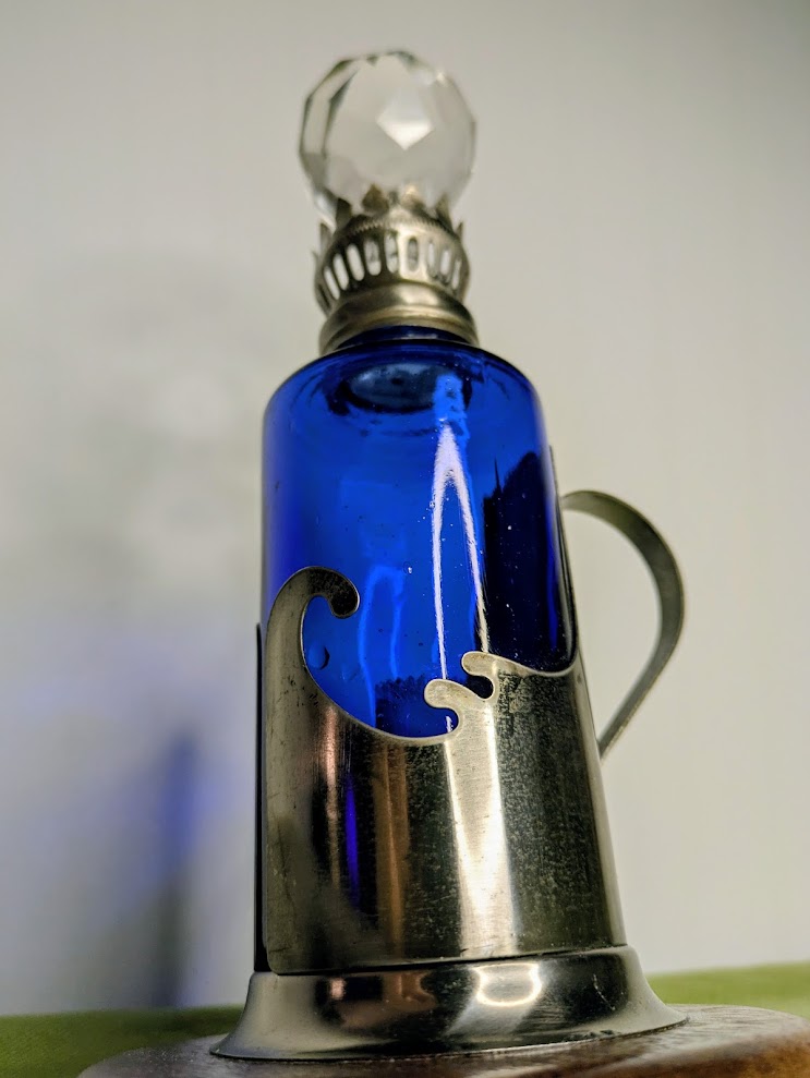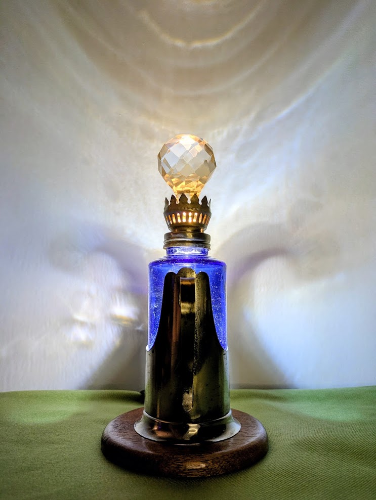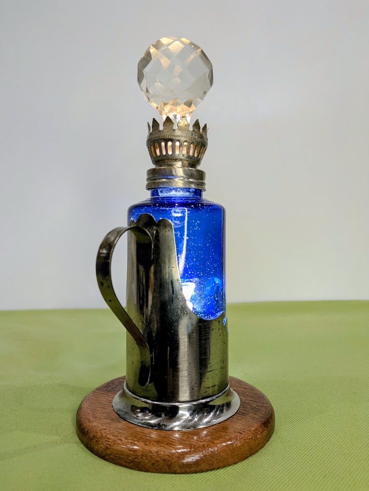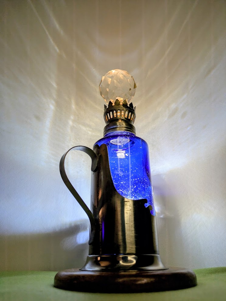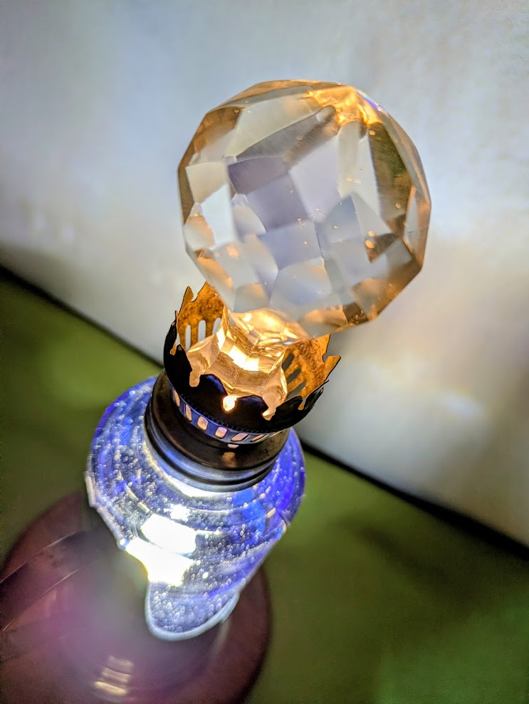 Et puis, un matin, le déclic…nous avons électrifié l’intérieur de la lampe afin de faire ressortir l’éclat du verre bleu et positionné un ancien bouchon de carafe en cristal facetté sur le dessus.