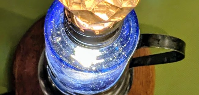 Nous avons chiné, il y a fort fort longtemps, une petite lampe à pétrole bleue sans trop imaginer sa future transformation.