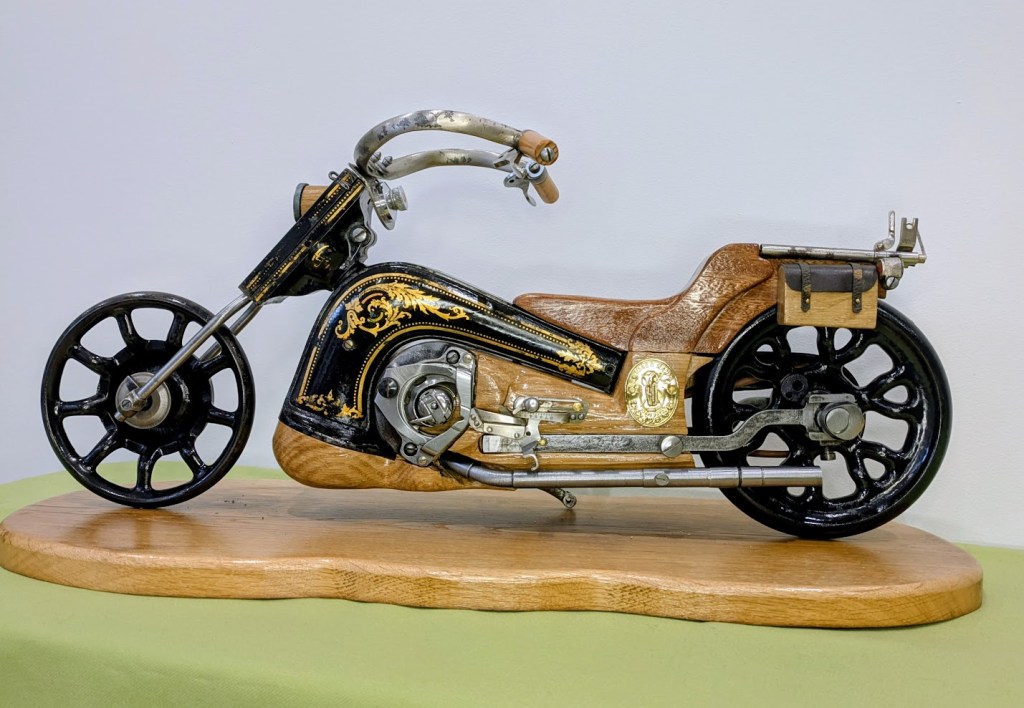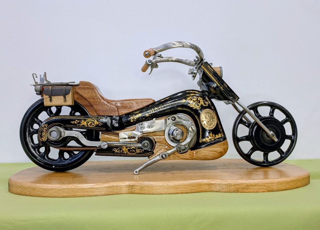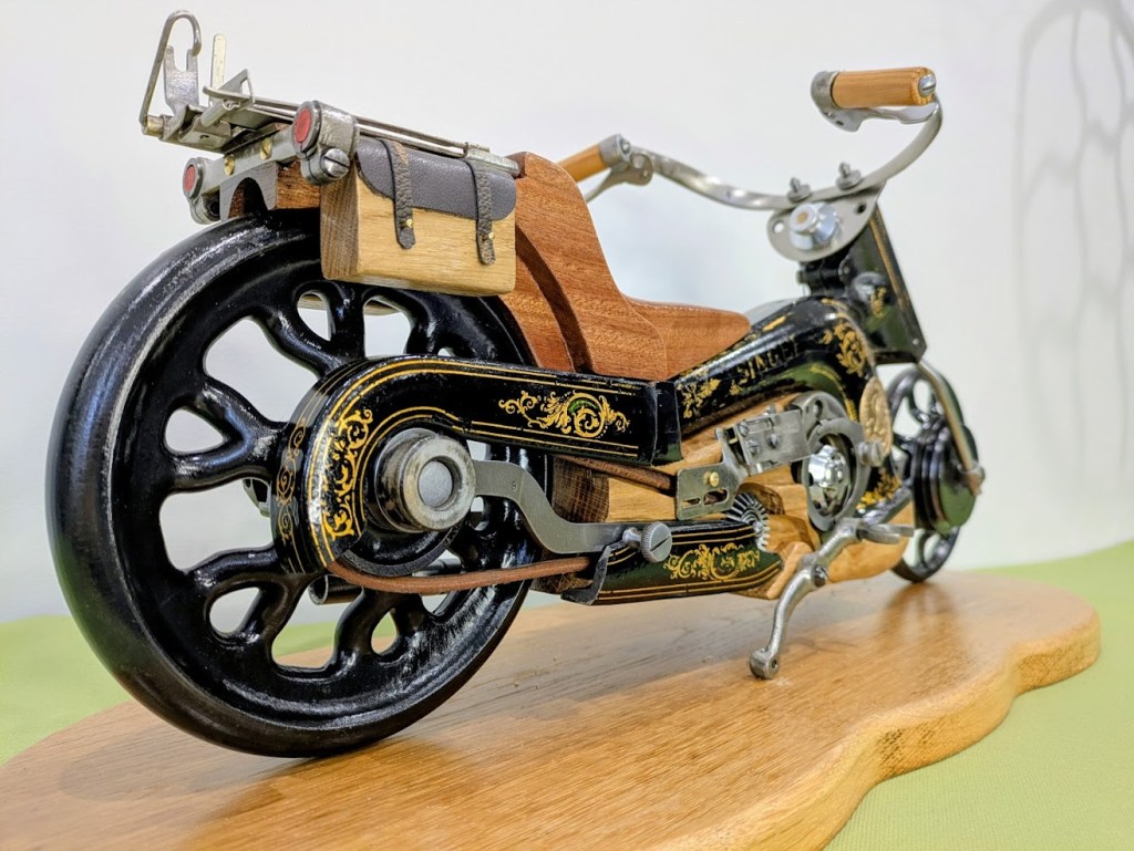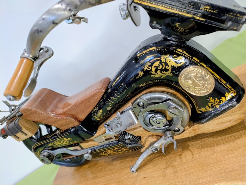 Pour notre 6ème moto, nous sommes partis d’une trés ancienne machine à coudre avec son plateau en forme de violon mais surtout, avec un petit gabarit parfait pour ce bolide.