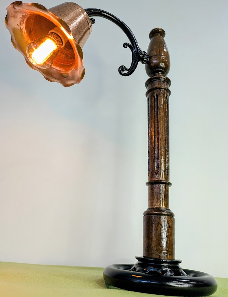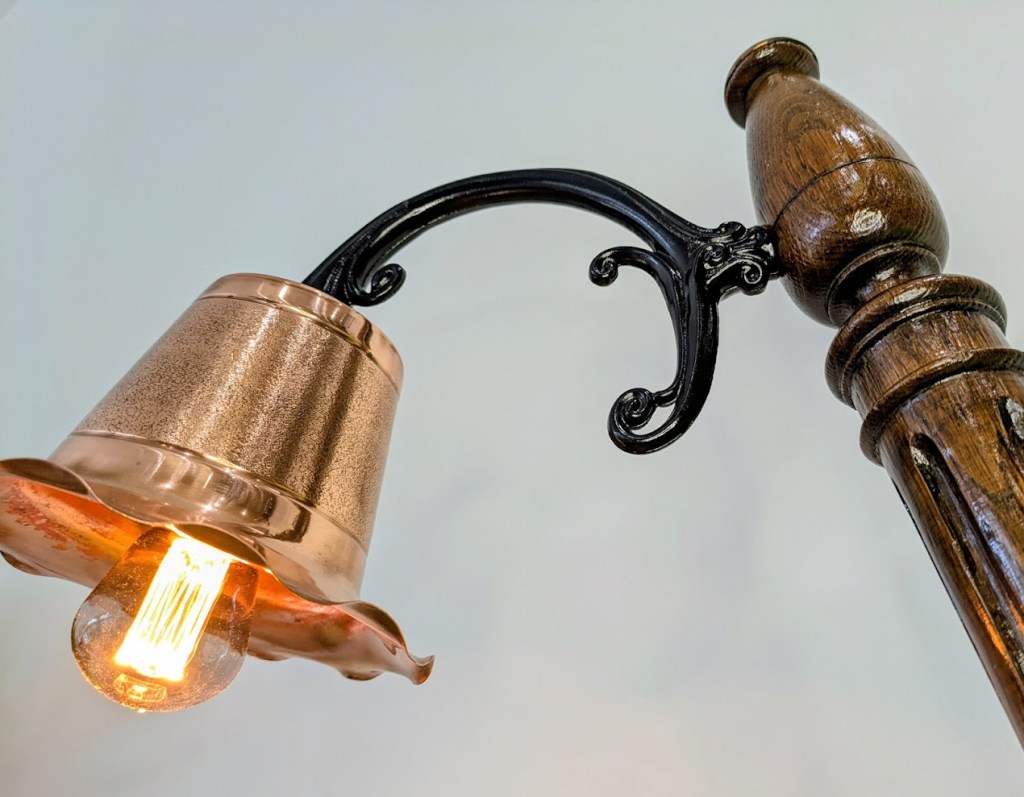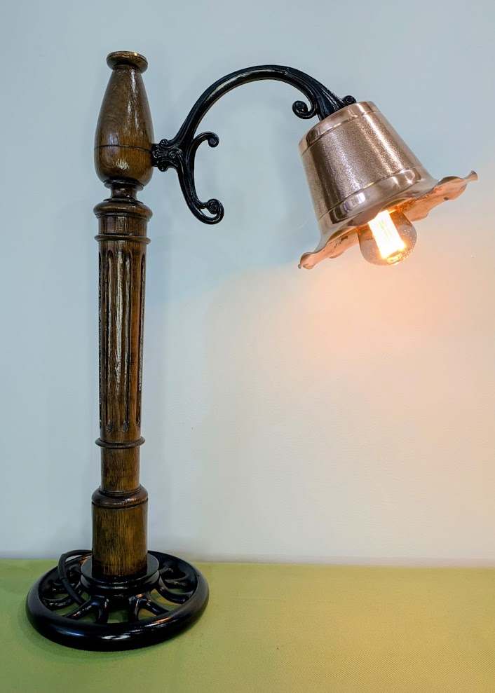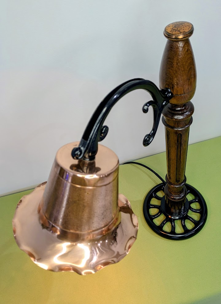 Réalisée à partir d’un morceau de pied de table, posé sur un volant de machine à coudre, une branche de lustre en métal positionne une clochette en laiton.