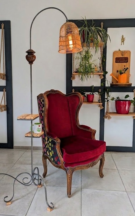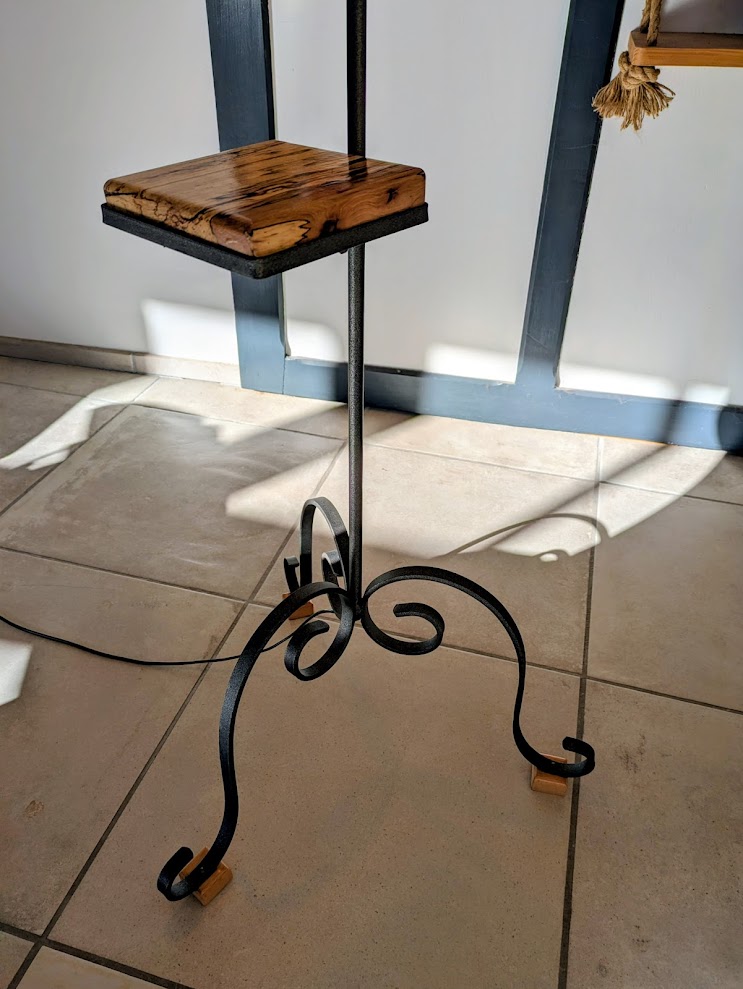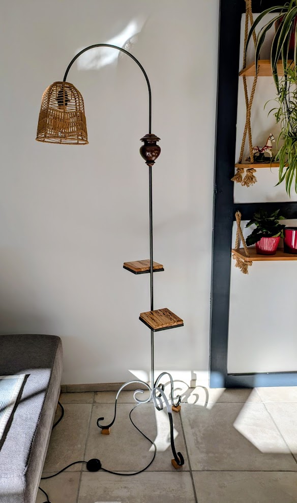 Belle-maman nous a donnĂ© une structure en fer forgĂ© de lampadaire typique des annĂ©es 70. Il lui manquait la partie haute et la couleur noire avait mal vieilli mais mĂȘme pas peur… ce vieux lampadaire va vivre une belle 2Ăšme vie.