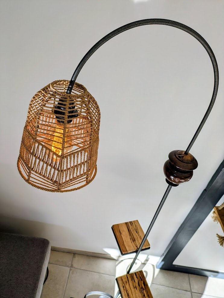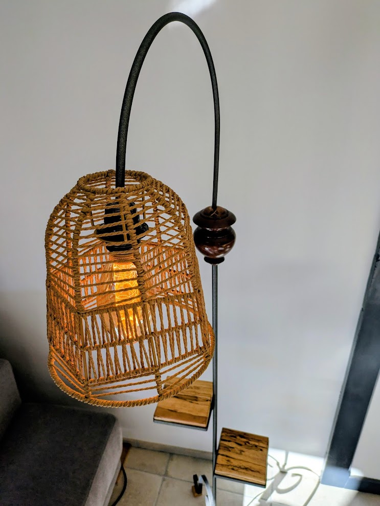 Nous avons fait le choix d’utiliser plusieurs essences de bois pour l’agrĂ©menter : plateaux en hĂȘtre Ă©chauffĂ©, boule en chĂȘne et semelles en hĂȘtre. Et pour lui donner de la hauteur et du cachet, nous lui avons ajoutĂ© un arc avec un abat-jour retombant.