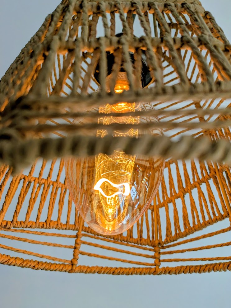 Pour tamiser la lumiĂšre, un bel abat-jour en corde dans lequel nous avons mis une superbe ampoule LED .